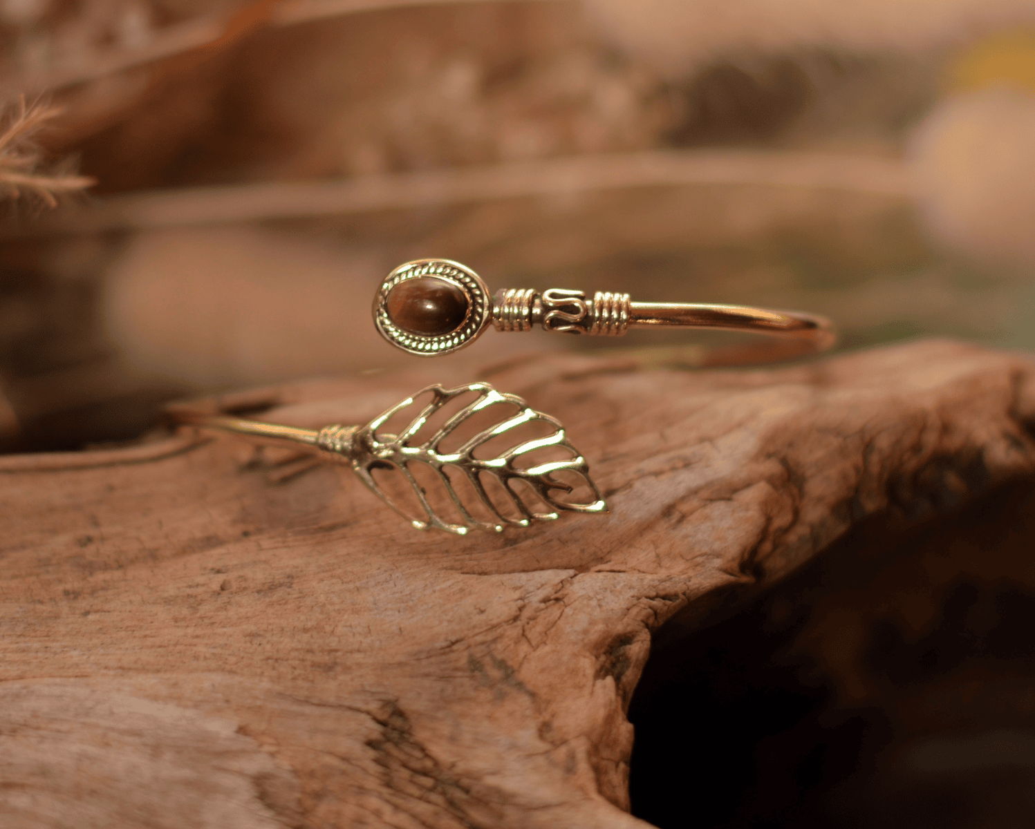 Verspielter Armreif mit filigranen Blattmuster. Besetzt mit echten Tigerauge Halbedel Stein.