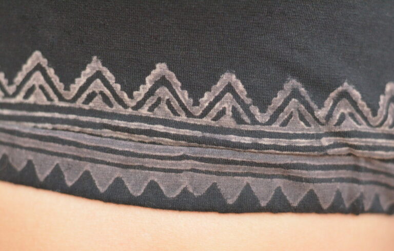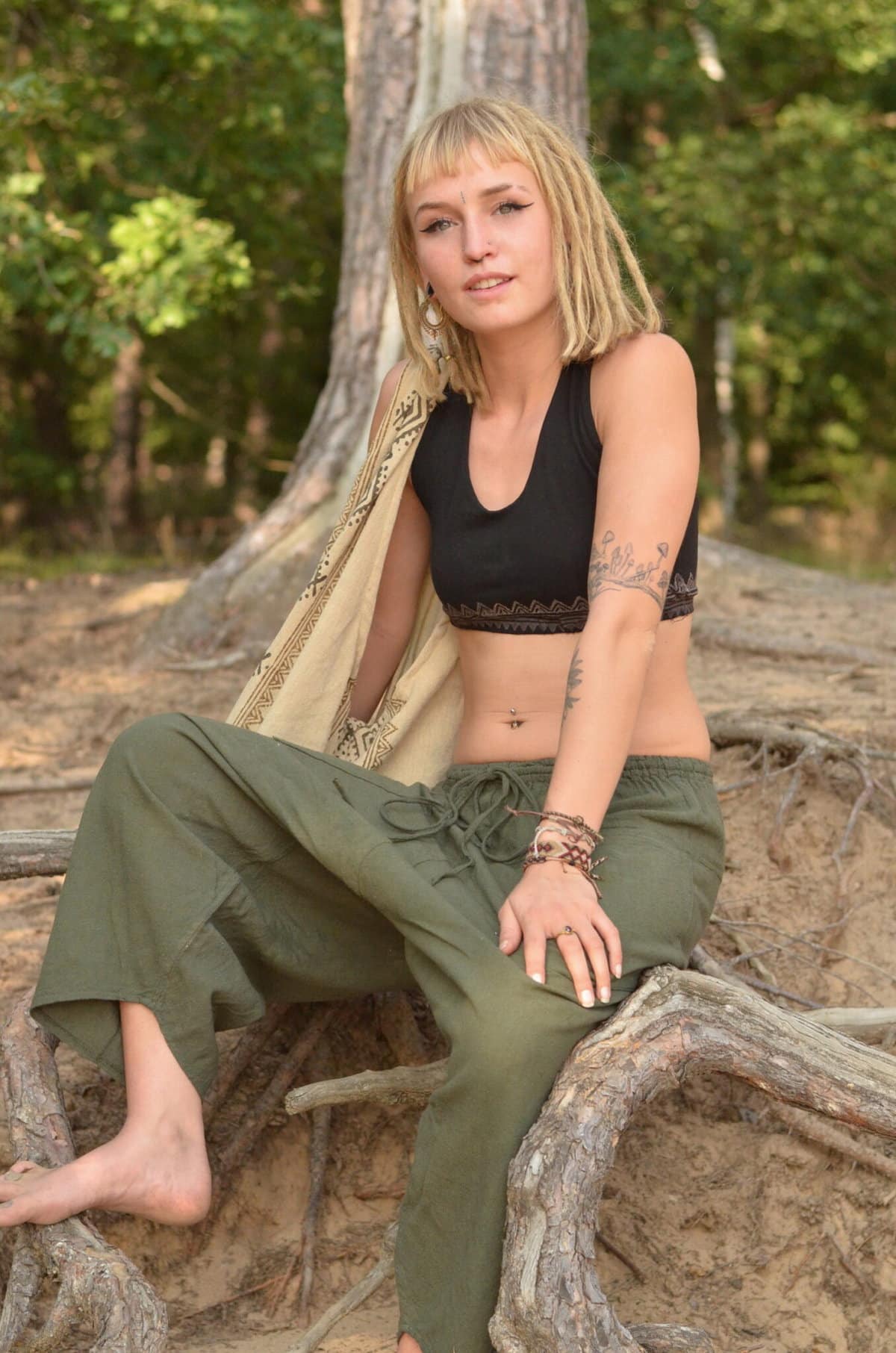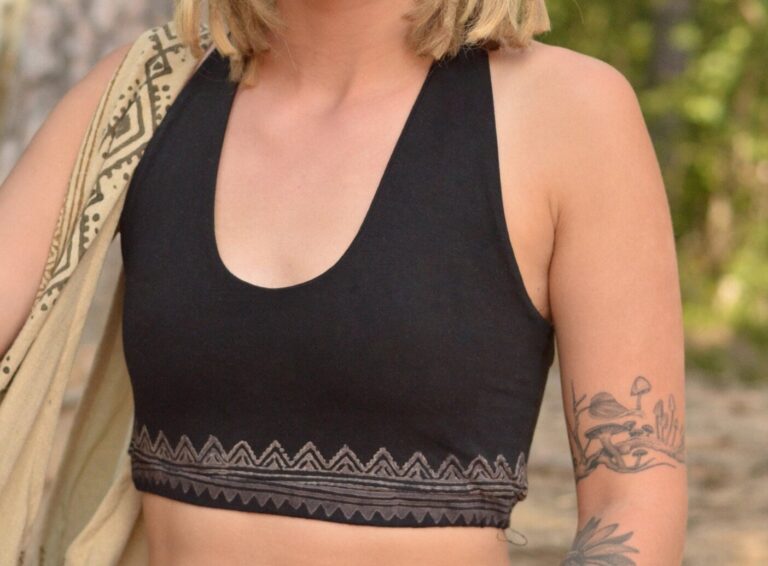Verspielter Bustier mit Blume des Lebens-Symbol. Mit feinen Blockprint Mustern umspielt. Die Musterung entsteht in Handarbeit und mit natürlichen Farben.