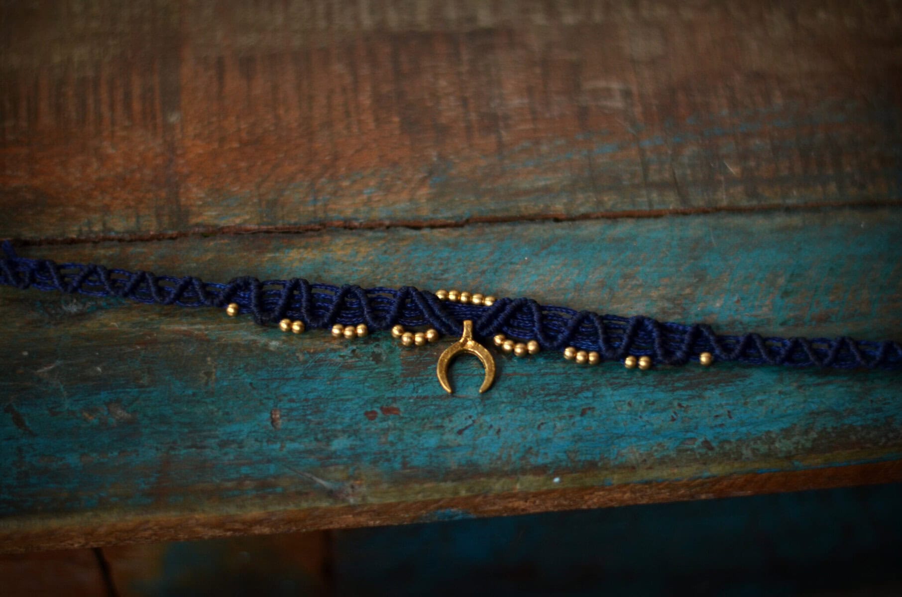 Verleihe deinem Look eine mystische Note mit dieser handgefertigten Makramee Kette, die du nicht nur als stylischen Choker, sondern auch als zartes Tiara tragen kannst. Der besondere Hingucker ist der Halbmond-Anhänger aus Messing, der an spirituellen Symbolismus und einen Hauch von Magie erinnert.