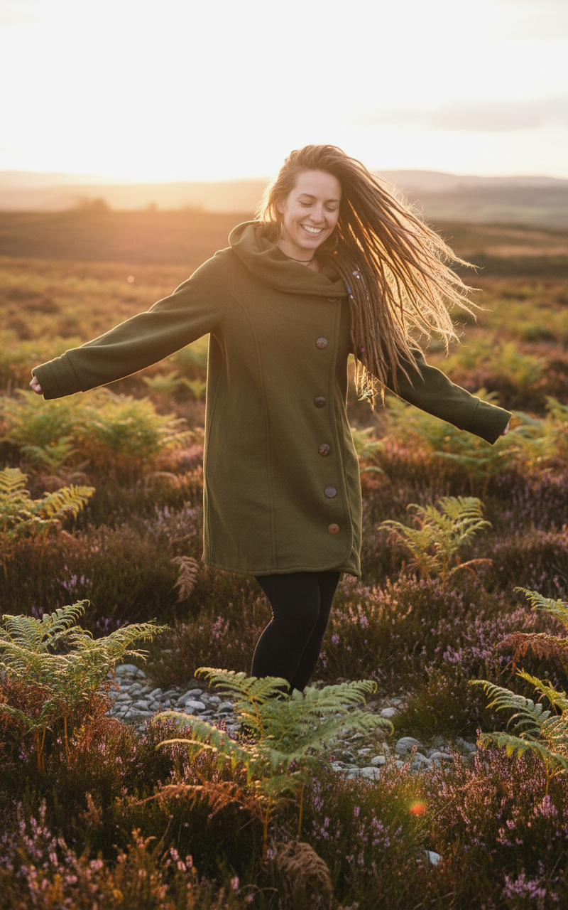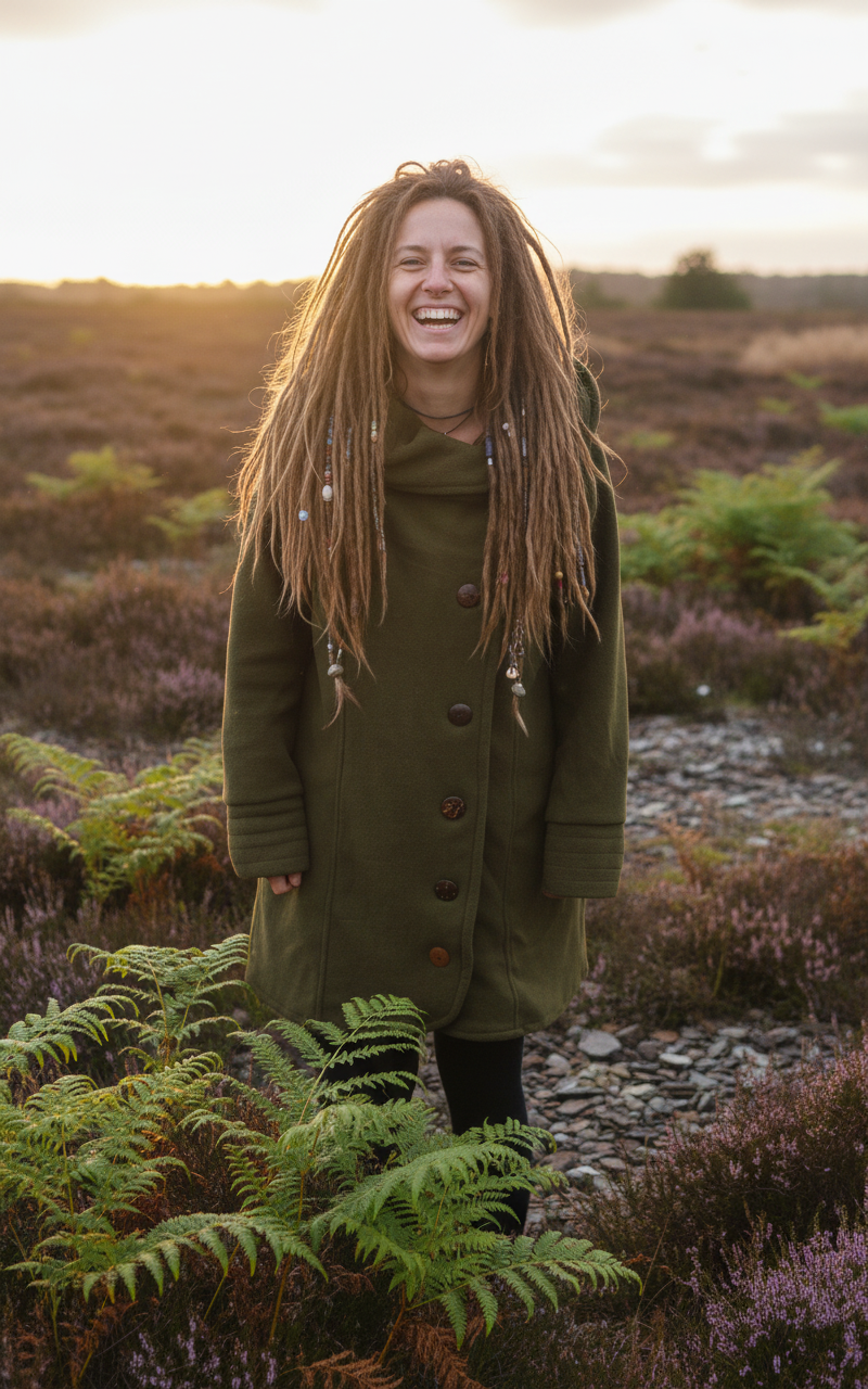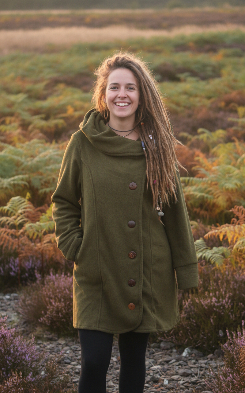 Die Jacke lässt sich mit Knöpfen aus Kokosnuss-Holz verschließen. Sie hält unheimlich warm und ist durch den leichten Oversize Schnitt super gemütlich.