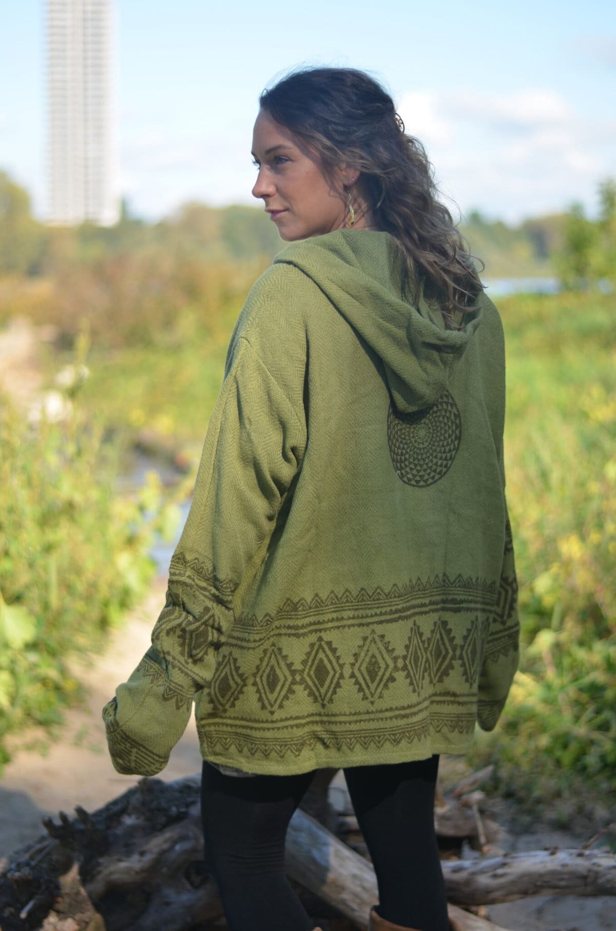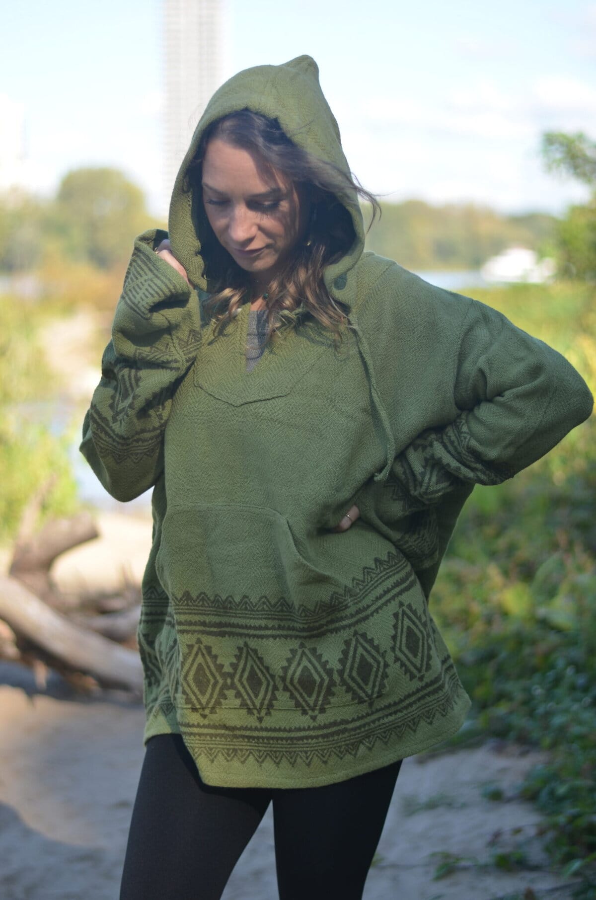 Die organischen Farben und die natürliche Struktur der Baumwolle verleihen diesem Poncho mit Kapuze einen besonderen Charme. Die liebevoll gestalteten Blockprintmuster, die ebenfalls in Handarbeit entstehen, machen jedes Stück zu einem echten Kunstwerk. Das absolute Highlight ist das Mandala im Rücken, inspiriert von Sacred Geometry, das auch eine tiefere Bedeutung trägt.