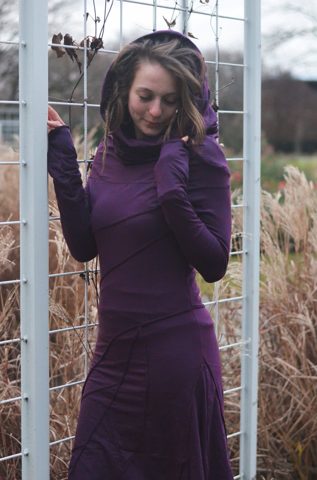 Das Kleid kommt mit einer gemütlichen Kapuze daher und lässt sich toll kombinieren.