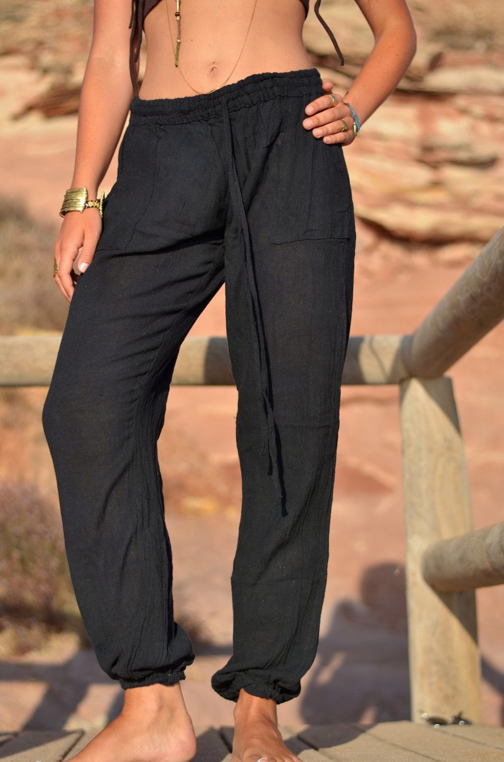 Die Hose ist super gemütlich und fällt luftig. Aus hangewebten Baumwoll-Stoff. Sie passt sich wunderbar an.