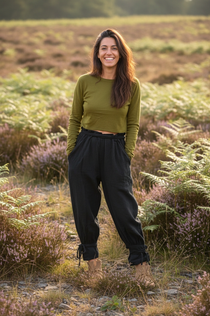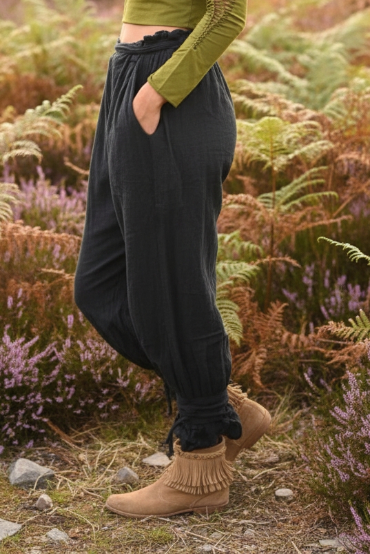 Die Hose wird am Bund geknotet, so entsteht ein schöner Lagenlook.
