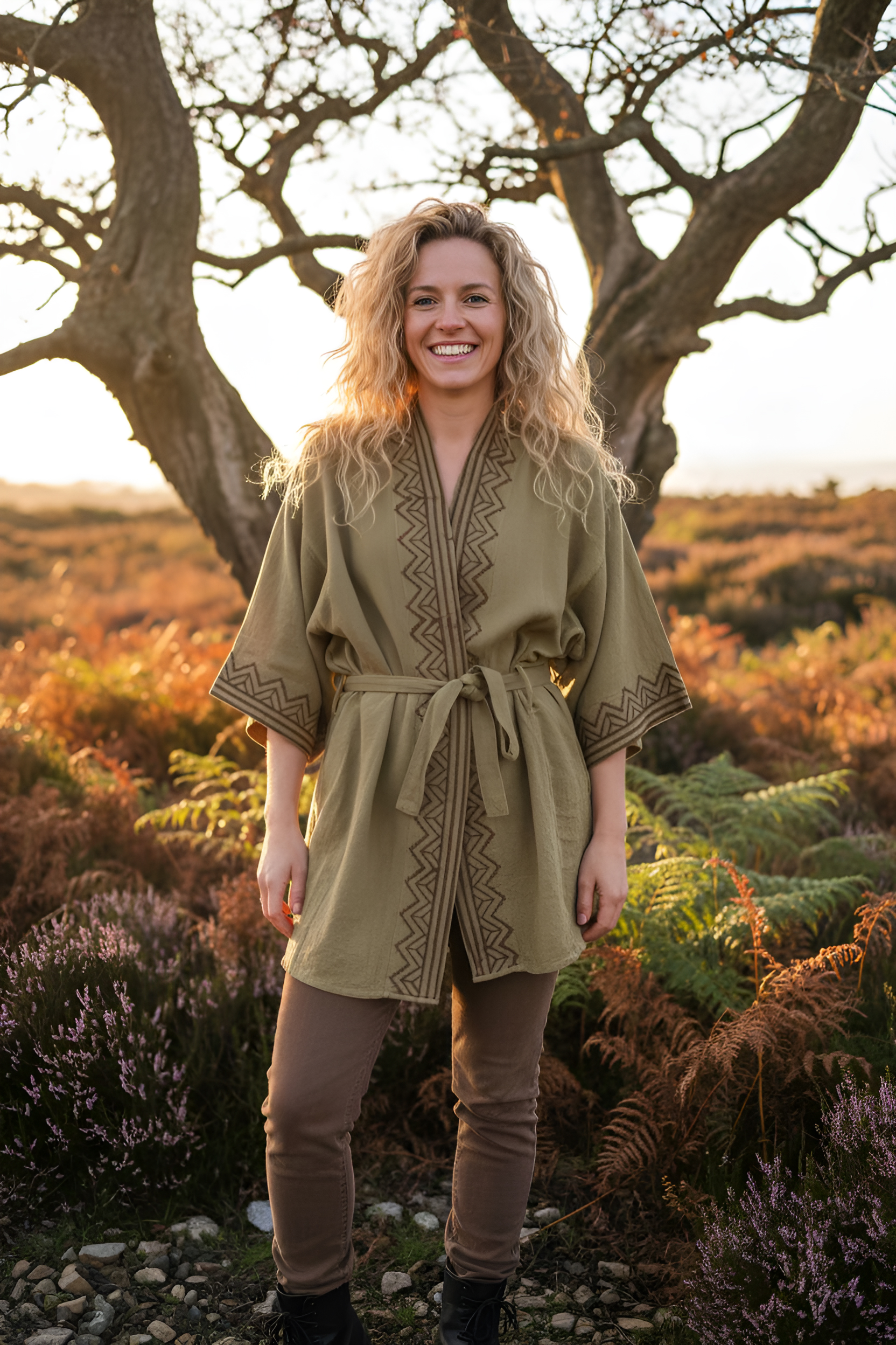 Entdecke die Kimono Jacke aus natürlicher Rohbaumwolle in einem zarten Salbei Pastellton mit verspielten Mustern. Diese Jacke ist mehr als nur ein Kleidungsstück – sie ist ein treuer Begleiter in deinem Alltag, der dir Freiheit und Stil zugleich schenkt. Die weiche Rohbaumwolle verleiht der Jacke eine einzigartige, natürliche Struktur, die nicht nur gut aussieht, sondern auch dafür sorgt, dass deine Haut atmen kann.