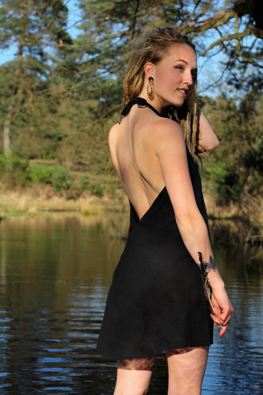 Dieses traumhafte Kurzkleid ist aus Baumwolle. Es lässt sich wie ein Neckholder binden. Im Rücken fällt es mit einem tiefen Ausschnitt, denn auch ein hübscher Rücken kann entzücken.