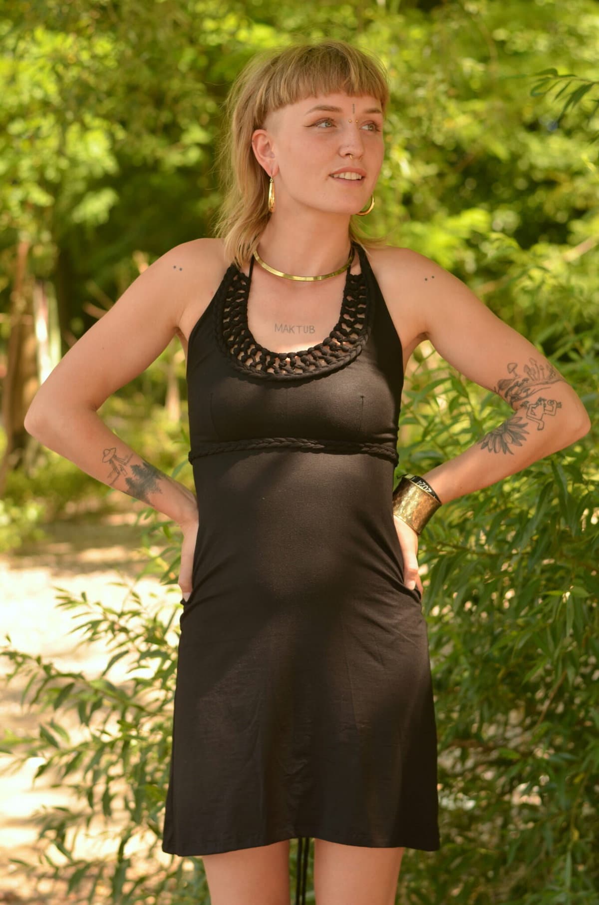 Mit vielen kleinen Specials verarbeitet. Aus stretchfähigen, weichem Baumwoll-Jersey gefertigt schmiegt sich das Kleid an deine Figur an. Das Dekolett und die Träger fallen im schönen Flecht-Lagenlook und werden von einem Messing-Element mit Same des Lebens im Rücken vereint. Hinten ist das Kleid rückenfrei und kann mit den Schnüren je nach Belieben geschnürt werden.