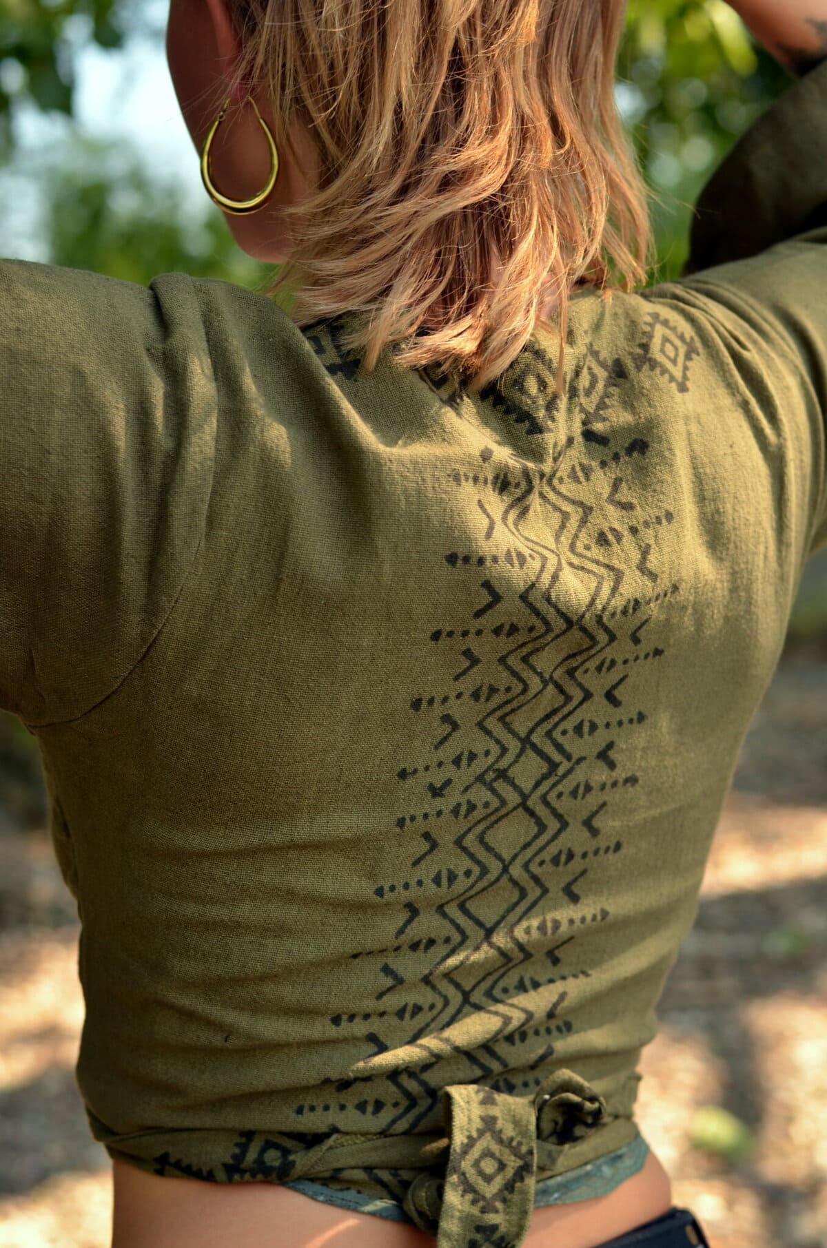 Du kannst das Top geknotet wie ein Croptop tragen. Dabei kannst du frei entscheiden, ob du es als Knotentop vorne binden magst oder über den Rücken verknotest. Und auch offen lässt sie sich schön im Lagenlook kombinieren.