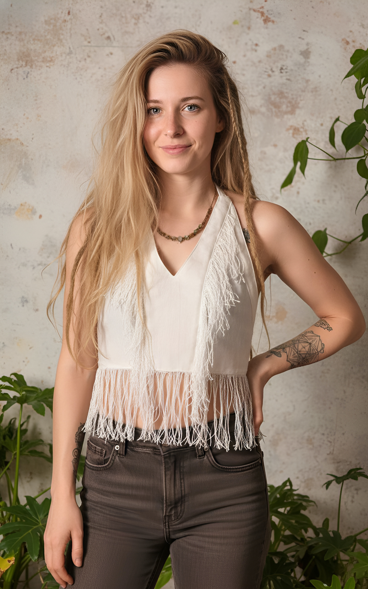Die feinen Fransen am Saum verleihen dem Top seinen unverwechselbaren Boho-Charme – verspielt, aber mit Tiefe. Es fließt bei jeder Bewegung, fängt das Licht ein und bringt diesen freien, ungefilterten Spirit in jedes Outfit.