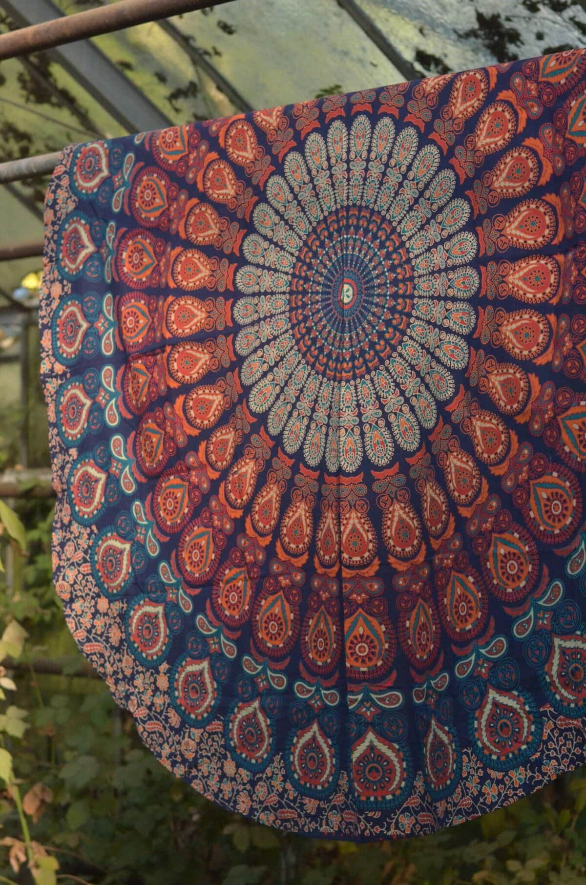 Das runde Mandala Tuch macht sich wunderbar als Tischdecke oder Wandtuch.