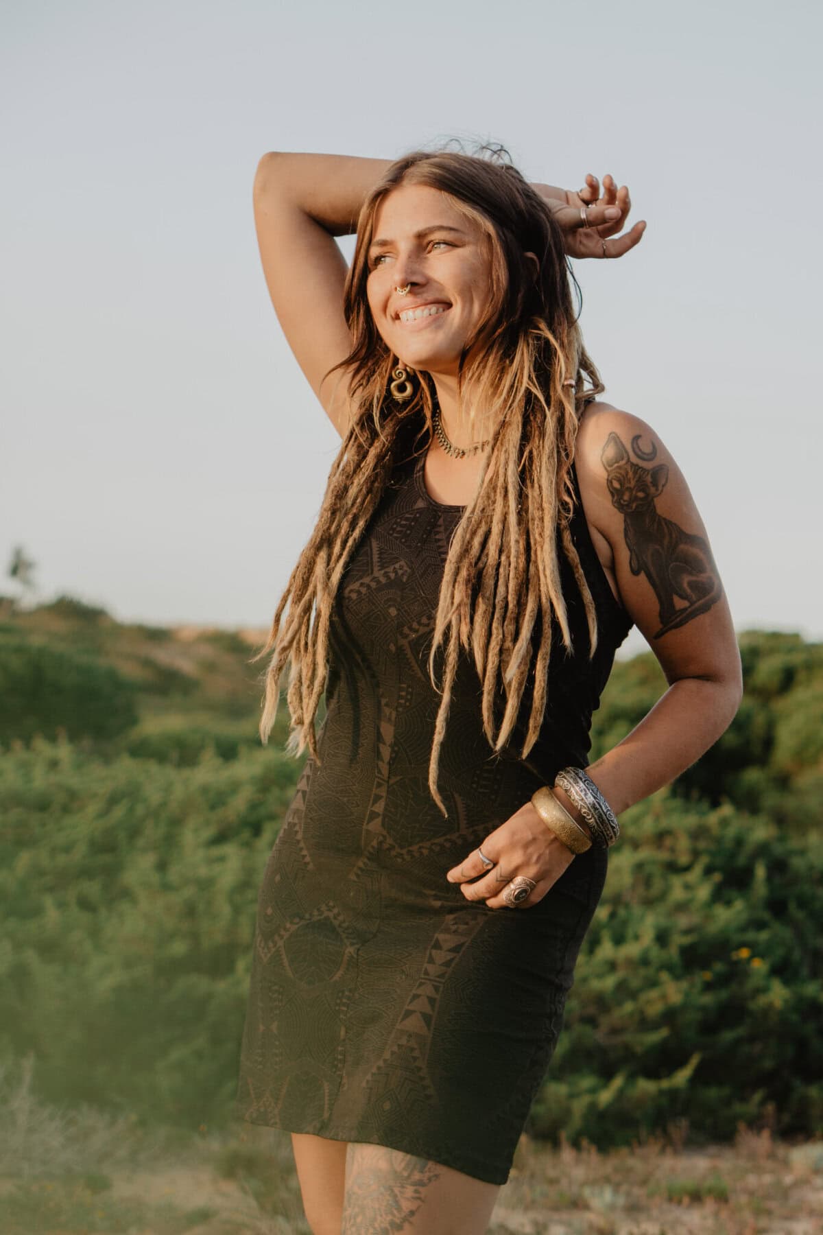Aus hochwertigem Baumwoll-Jersey gefertigt schmiegt sich das stretchige Kleid wunderbar der Figur an. Das Muster macht das Kleid zu einem Hingucker. Es begleitet dich treu durch den Sommer und über die Festivals.