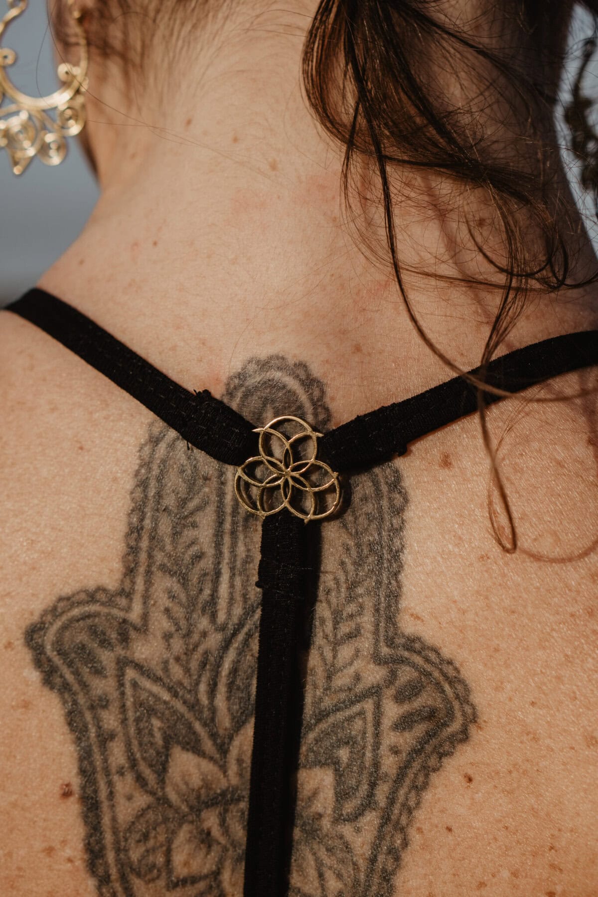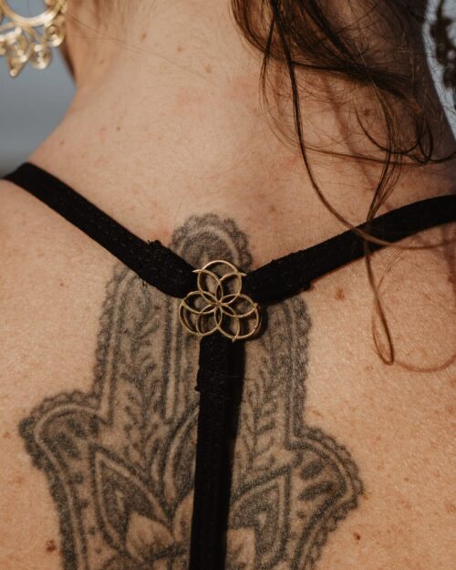 Das Top kannst du wunderbar zum Yoga mitnehmen, dein Festival-Outfit aufmotzen oder im Alltag als BH tragen. Es zaubert dir garantiert einen kleinen Hingucker in dein Outfit. Mit den Bändern und dem Messingsymbol im Rücken macht es sich wunderbar zu rückenfreien Kleidern & Tops.