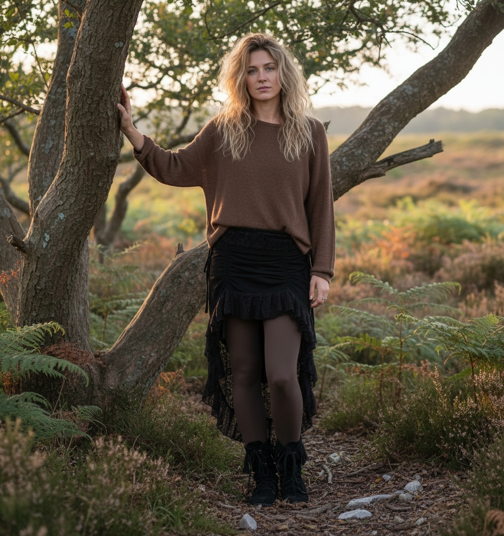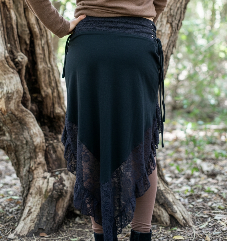 Mit seinem asymmetrischen Schnitt – vorne kürzer, hinten länger – schmeichelt er der Silhouette und lässt jede Bewegung leicht und fließend wirken. Die feine Spitze am Saum verleiht dem Rock eine geheimnisvoll-romantische Note, perfekt für Boho-Looks, Waldspaziergänge oder nächtliche Lagerfeuer.