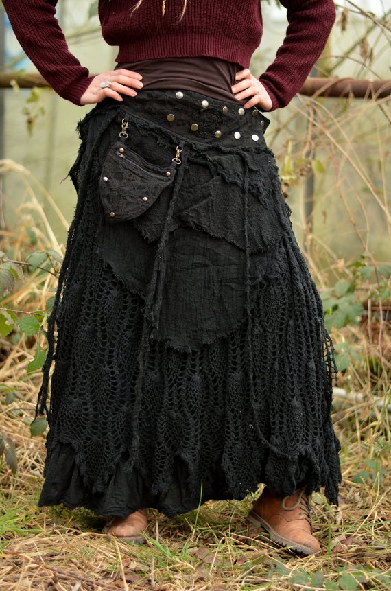 Der Rock fällt in unzähligen Lagen und ist mit verspielten Zipfelarbeiten, hochwertigem Materialmix, Spitze und Taschen verziert.
