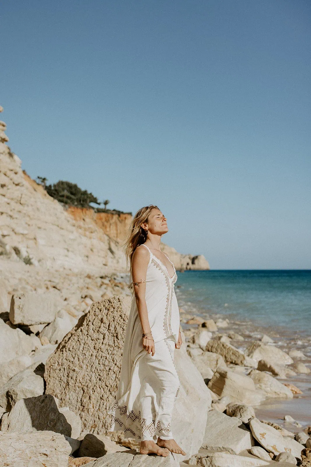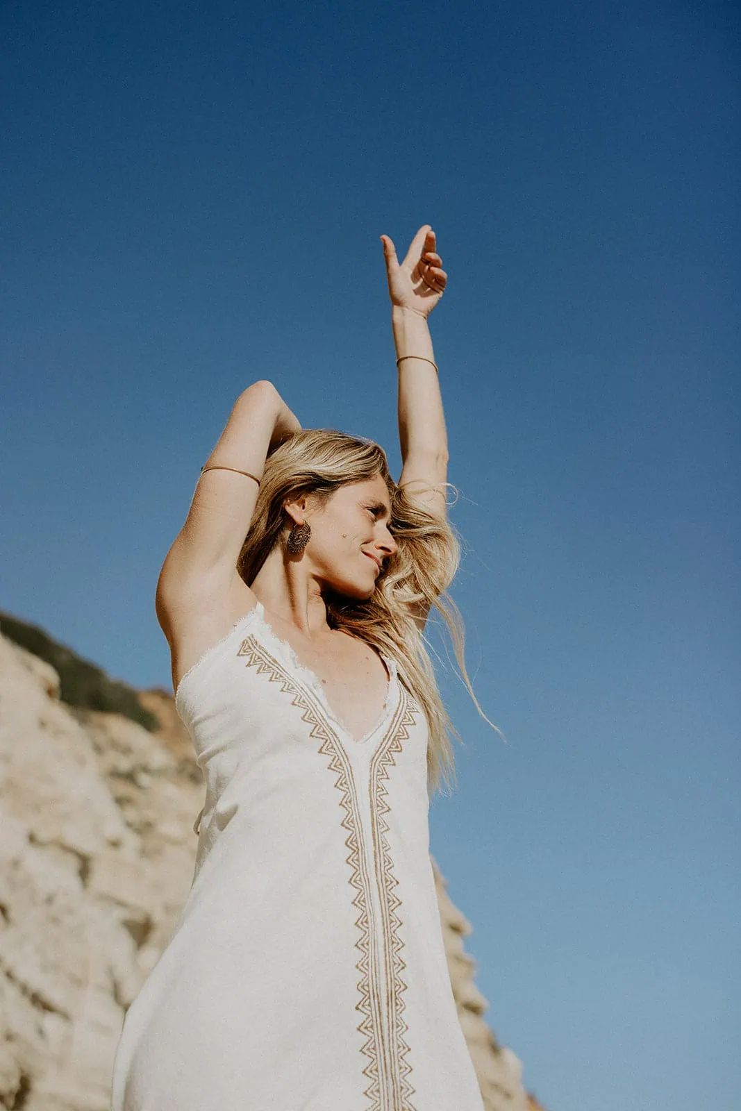 Dieses traumhafte, bodenlange Kleid ist aus hochwertiger, naturbelassener Baumwolle-Jute gefertigt und fällt mit schönem, rückenfreien Neckholder Schnitt. Der Bund und das Dekoltee des Kleides wird umspielt von feinen Blockprint Mustern, die in Handarbeit mit organischen Naturfarben entsteht und das Kleid zu einem schönen Hingucker im Sommer macht.