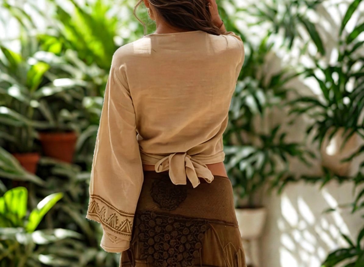 Entdecke das einzigartige Wickeltop, das mit Liebe und Hingabe aus hochwertiger, handgesponnener Baumwolle gefertigt wurde. Dieses besondere Oberteil ist ein absolutes Muss für jeden Hippie- Boho und Alternativmode-Liebhaber.