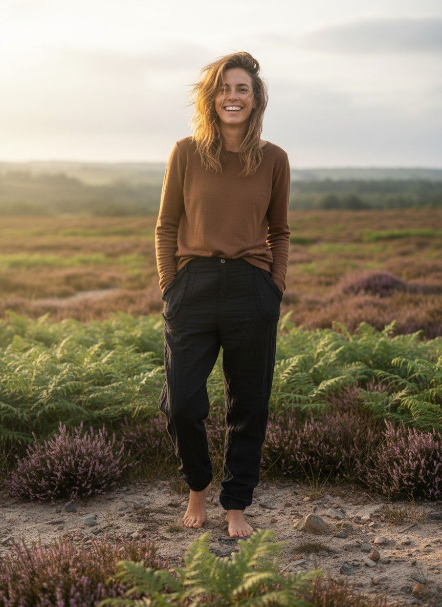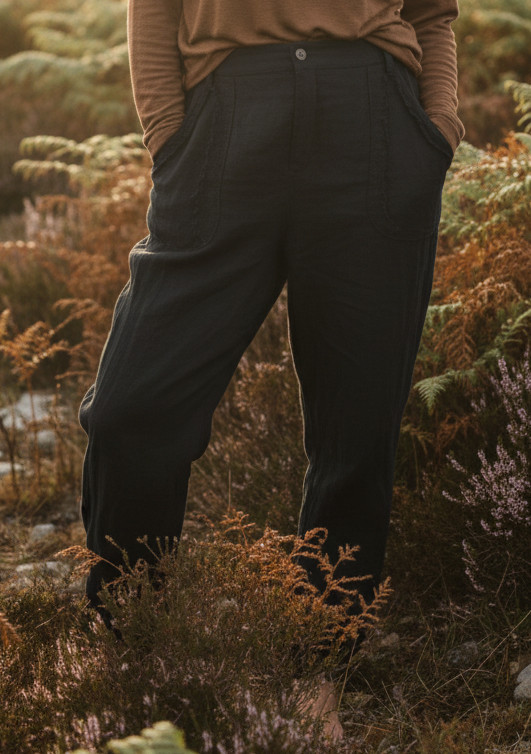 Der Gummizug im Rücken sorgt dafür, dass die Hose nie einengt – vielmehr schmiegt sie sich sanft an deine Körperform an und lässt dir die Freiheit, dich zu bewegen und die Welt zu erkunden. Der natürliche Kokosnussknopf, der die Hose vorne schließt, ist nicht nur praktisch, sondern auch ein kleines Stück Natur, das dich an die Verbundenheit mit der Erde erinnert. Die Schnallen für einen Gürtel bieten dir die Möglichkeit, deinen persönlichen Stil auszudrücken und die Hose nach deinem Geschmack zu stylen.