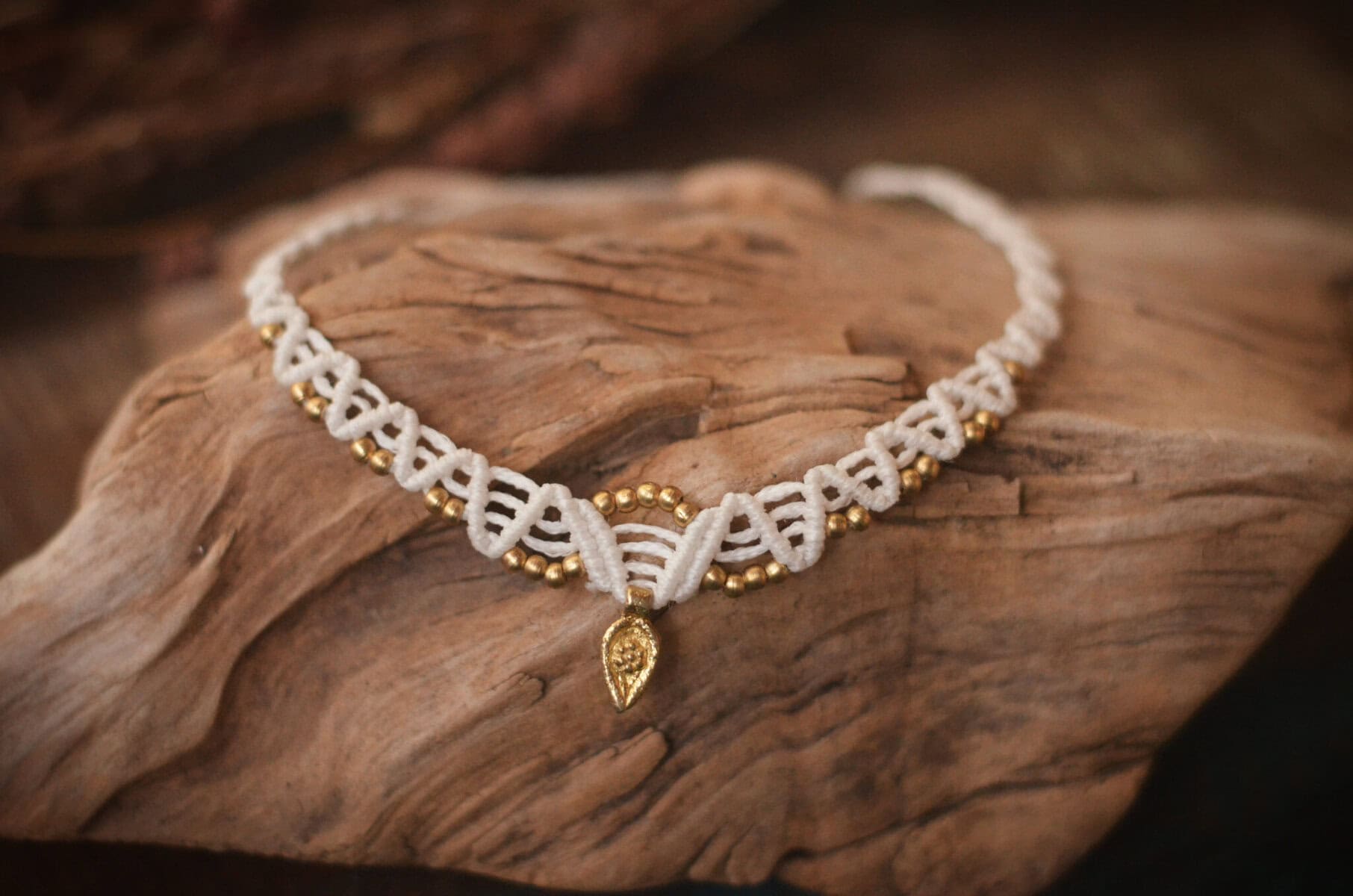Die 90er sind zurück! Die frechen engen Halsketten dürfen natürlich nicht fehlen. Die kurze Kette wurde mit Liebe von Hand geknüpft. Bei Makrameschmuck entsteht jedes Schmuckstück Knoten für Knoten. In die geknüpfte Kette sind hochwertige Messingperlen und Anhänger eingearbeitet, die den Schmuck zu einem echten Hingucker machen.