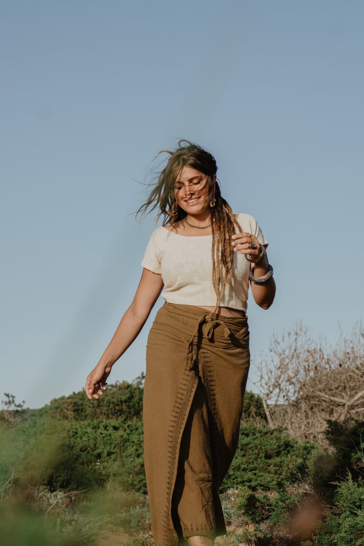 Verspieltes Top im Natural Crochet Style. Der Baumwollstoff wurde von hand gewebt.