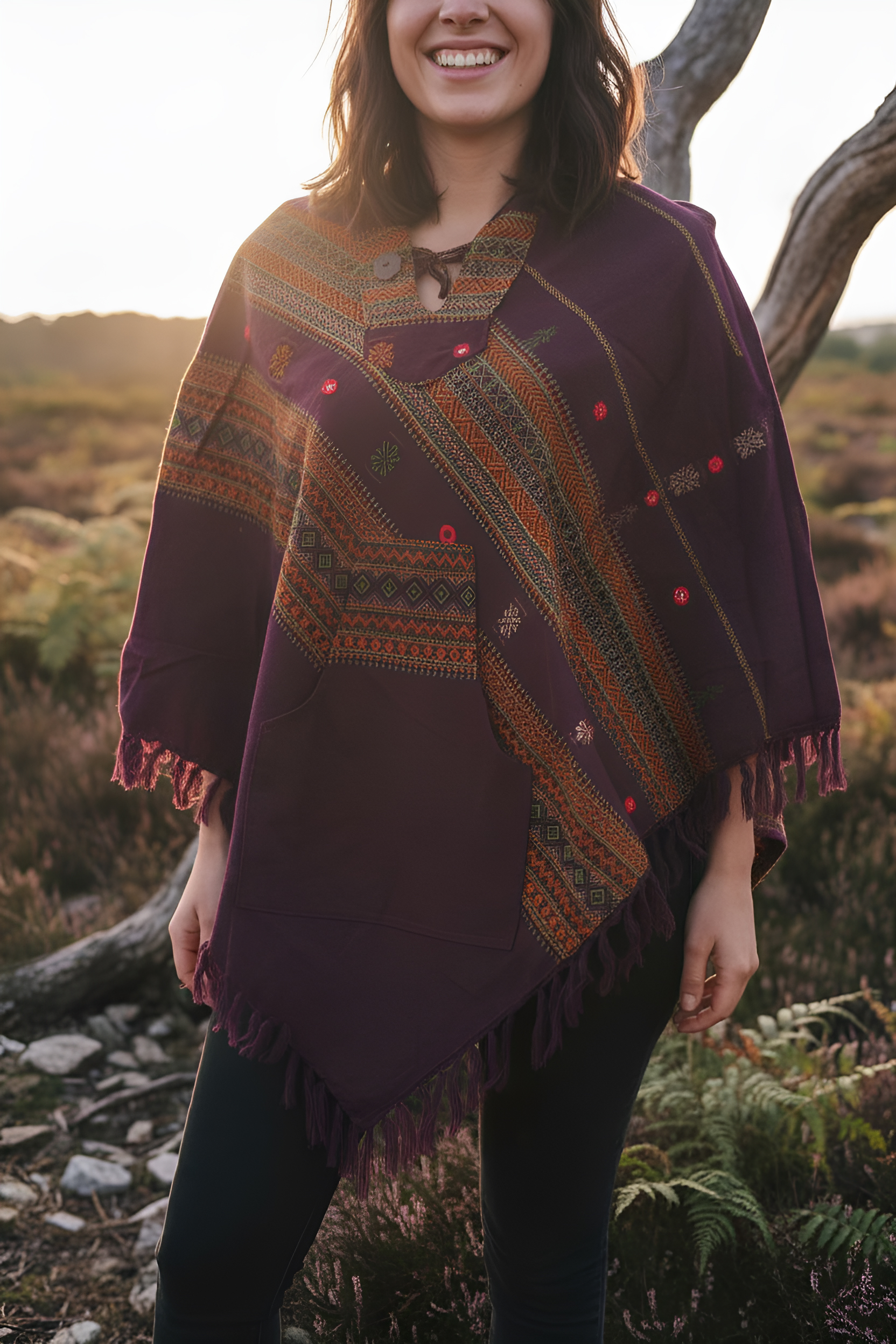 Mit seiner bequemen Kapuze, den Fransen und der geräumigen Fronttasche vereint dieser Poncho das Freiheitsgefühl des Hippie-Lebens mit der Funktionalität moderner Slow Fashion. Ob beim Spaziergang durch den Wald, auf Reisen oder eingekuschelt auf der Couch – er begleitet dich wie eine sanfte Erinnerung daran, dass du genau da bist, wo du hingehörst.