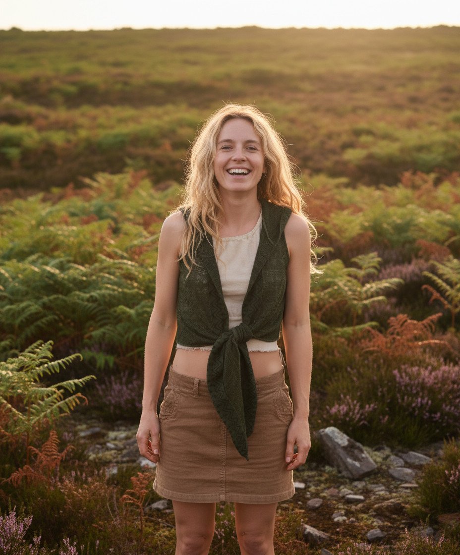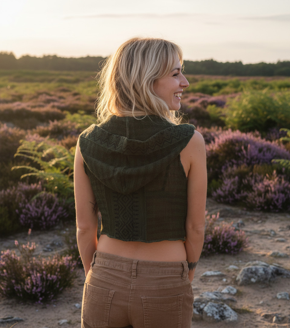 Eine schöne Zipfelweste mit natürlichem Chrochet Look. Das Netzmaterial gibt der Weste einen erdigen Look, der von den organischen Blockprints abgerundet werden. Die Muster der Weste entstehen in feiner Handarbeit mit natürlichen Farben.