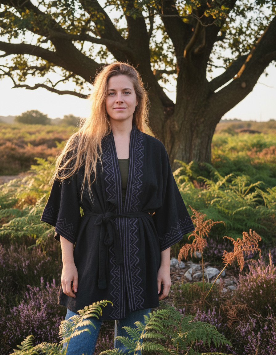 Entdecke die Kimono Jacke aus natürlicher Rohbaumwolle in einem zarten Salbei Pastellton mit verspielten Mustern. Diese Jacke ist mehr als nur ein Kleidungsstück – sie ist ein treuer Begleiter in deinem Alltag, der dir Freiheit und Stil zugleich schenkt. Die weiche Rohbaumwolle verleiht der Jacke eine einzigartige, natürliche Struktur, die nicht nur gut aussieht, sondern auch dafür sorgt, dass deine Haut atmen kann.
