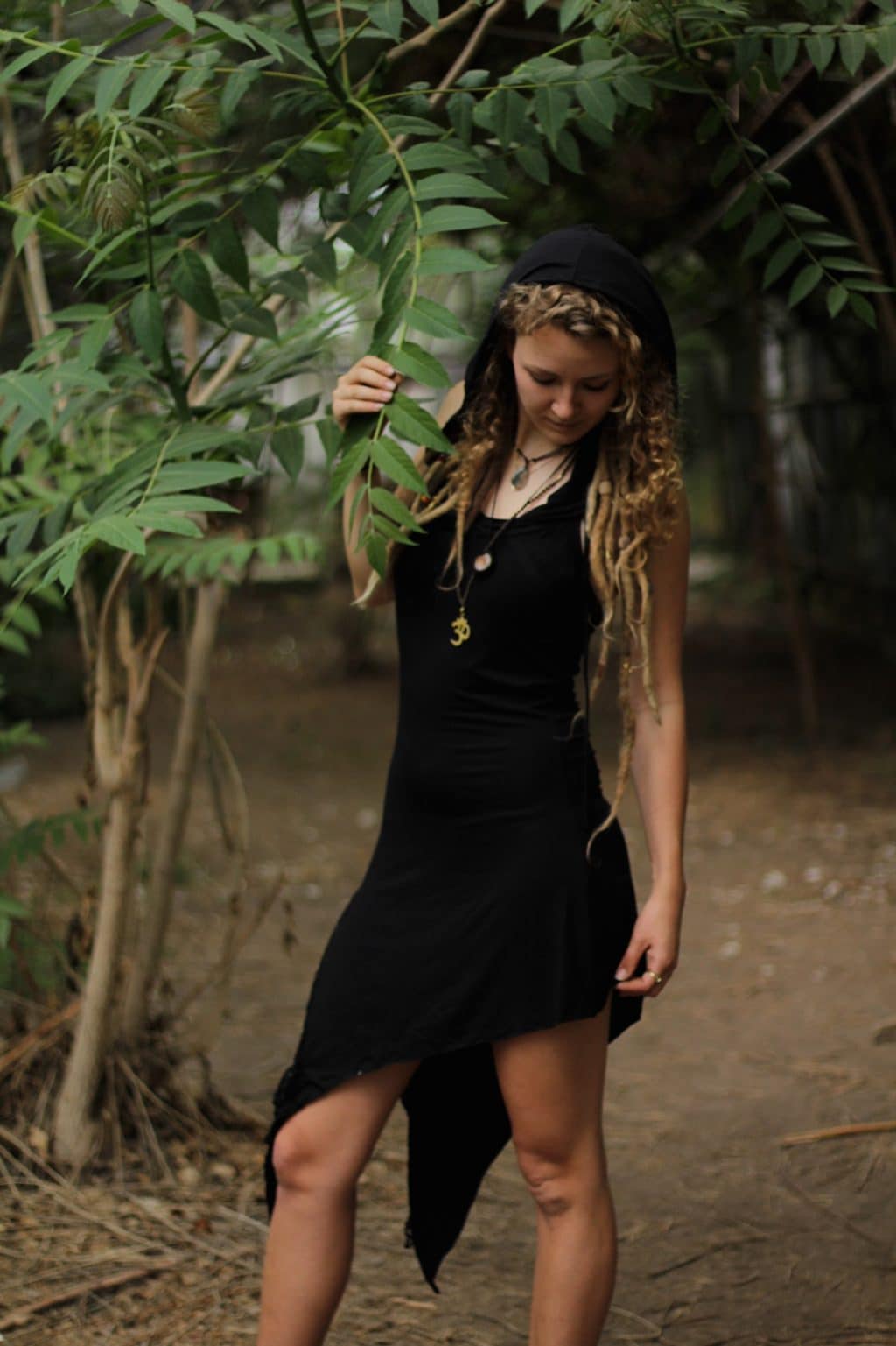 Das Kleid fällt mit Zipfeln. So entsteht ein luftiger Lagenlook.