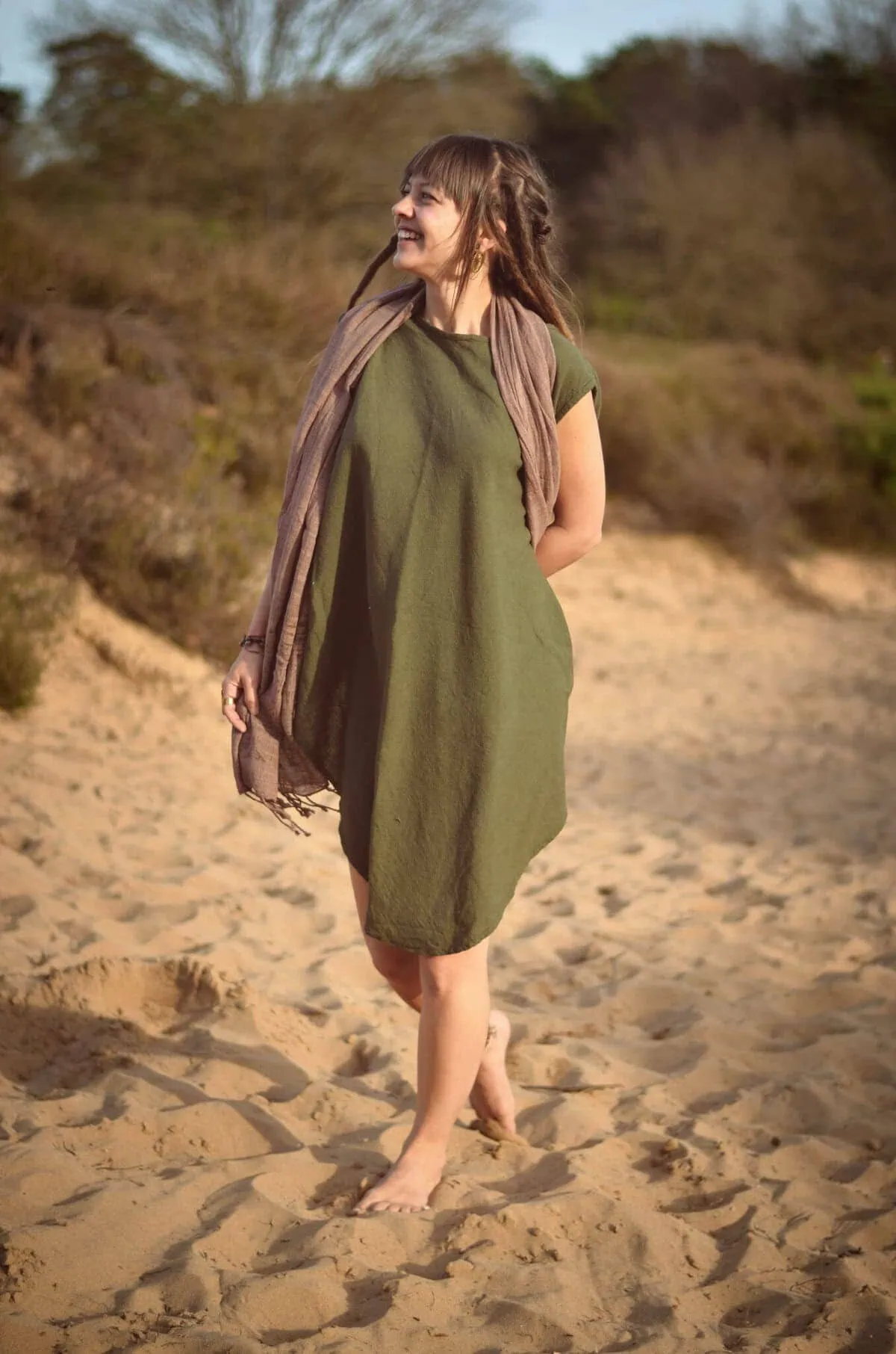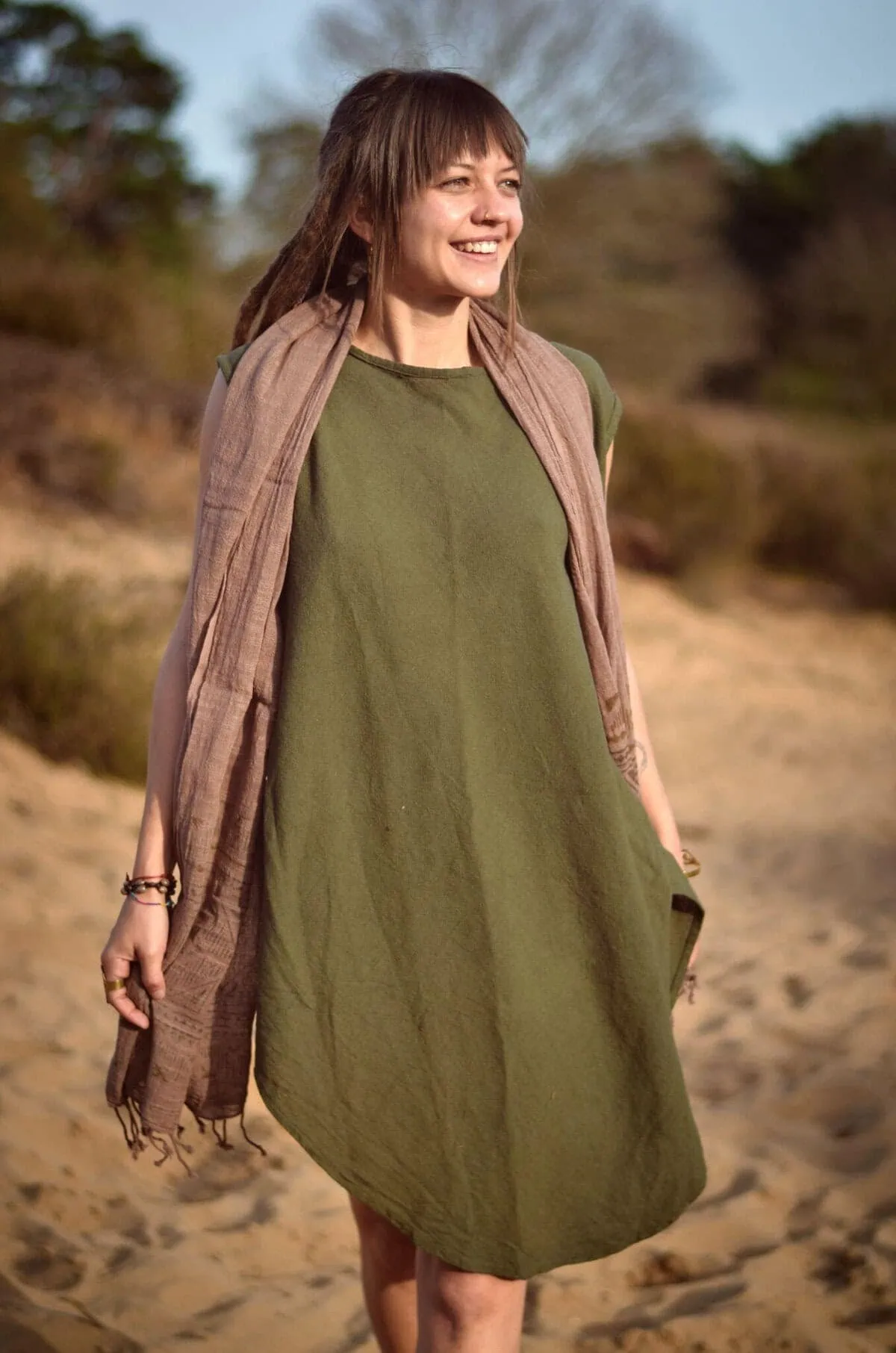 Ein schlichtes Kleid aus naturbelassener Baumwolle gefertigt. Die Baumwolle wurde nicht nachbehandelt und von Hand gefertigt. Dadurch entsteht der natürliche Style des Kleides.