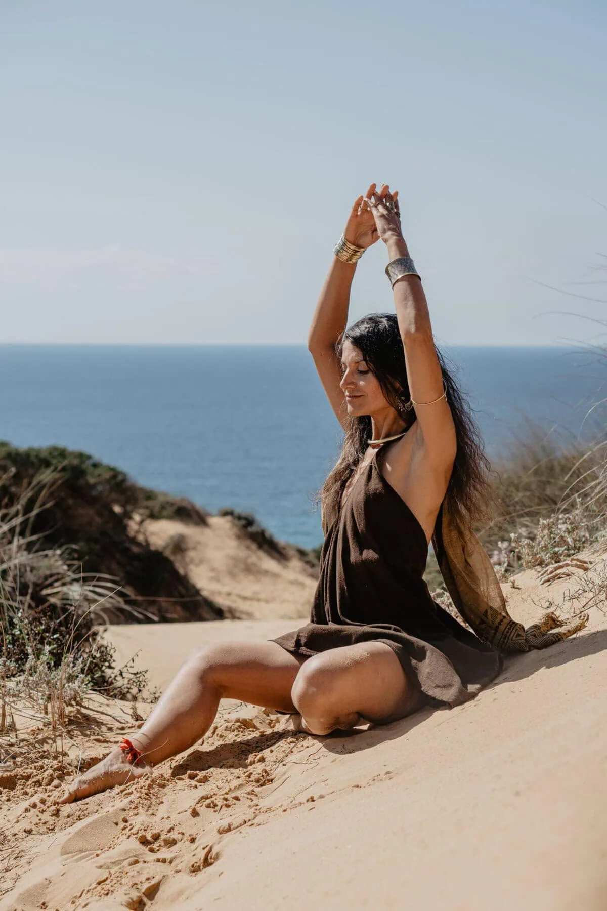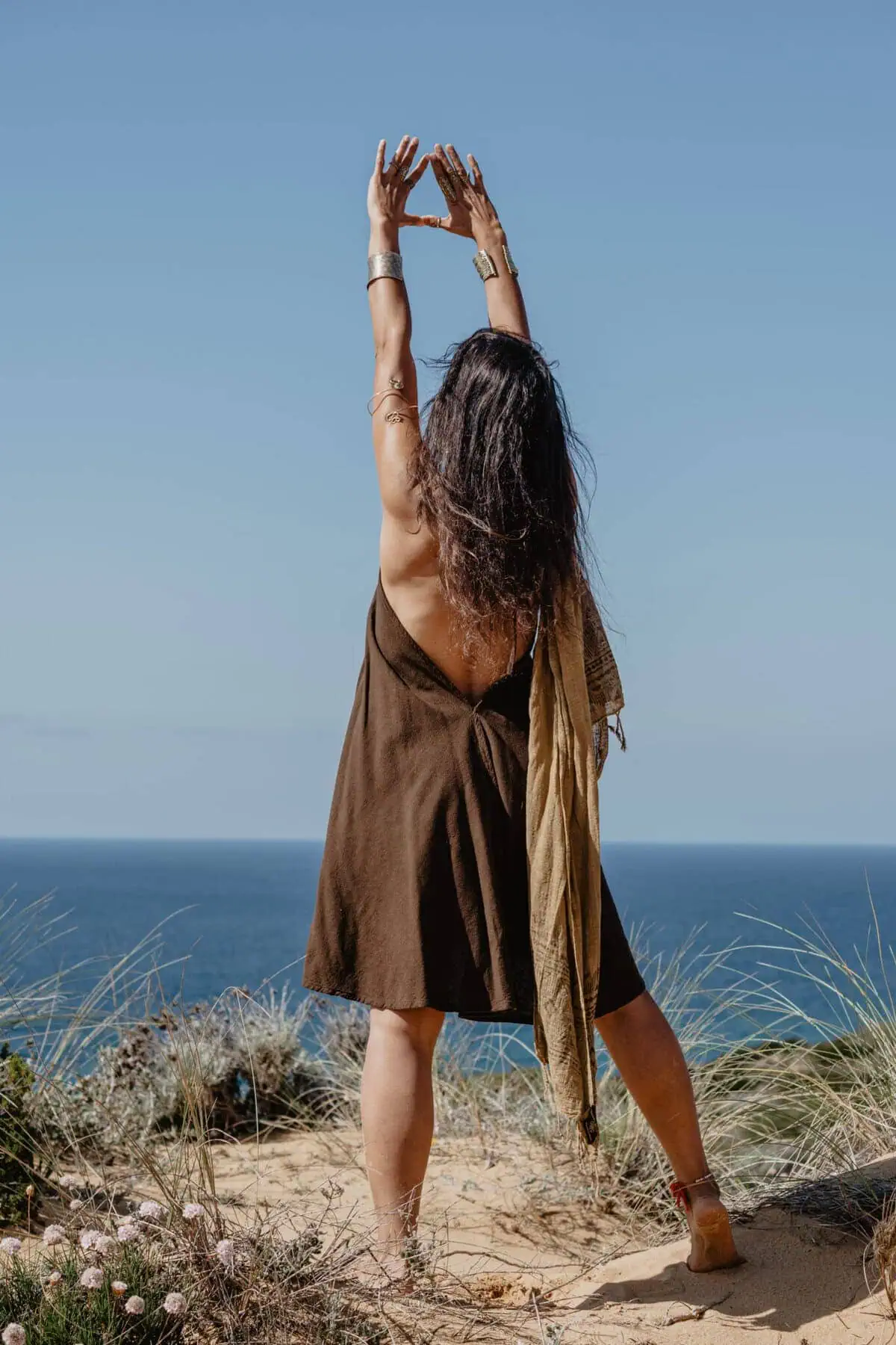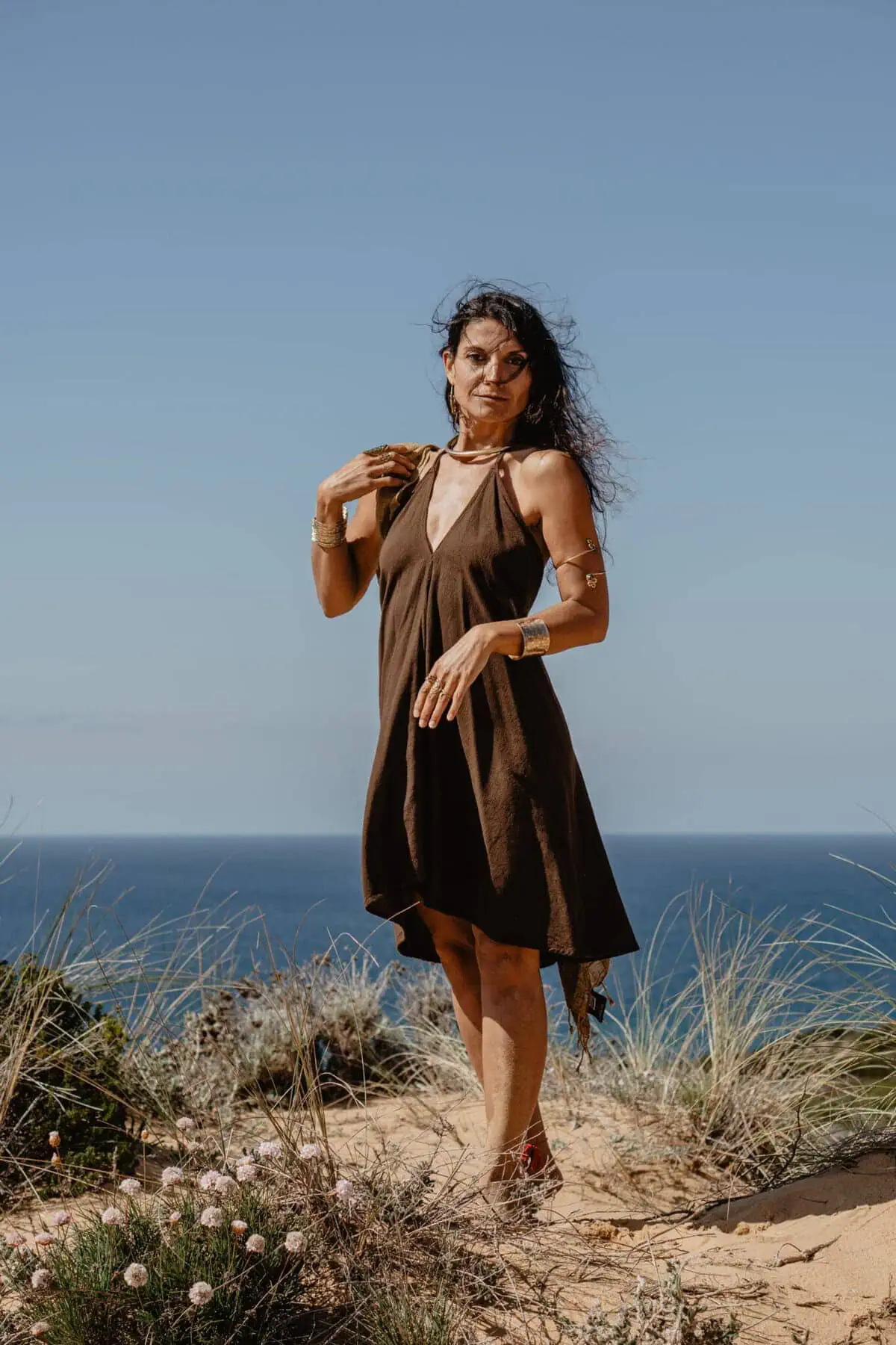 Dieses traumhafte Kurzkleid ist aus einem hochwertigen Baumwoll-Jutegemisch. Es lässt sich wie ein Neckholder binden. Im Rücken fällt es mit einem tiefen Ausschnitt, denn auch ein hübscher Rücken kann entzücken.