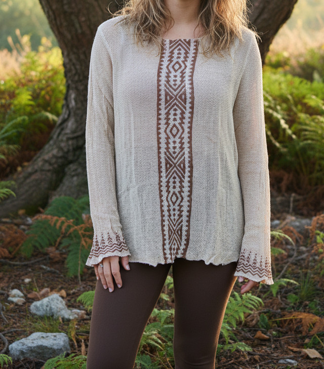 Ein natürlicher Pullover aus weichem Netzstoff. Mit feinen Blockprints verziert.