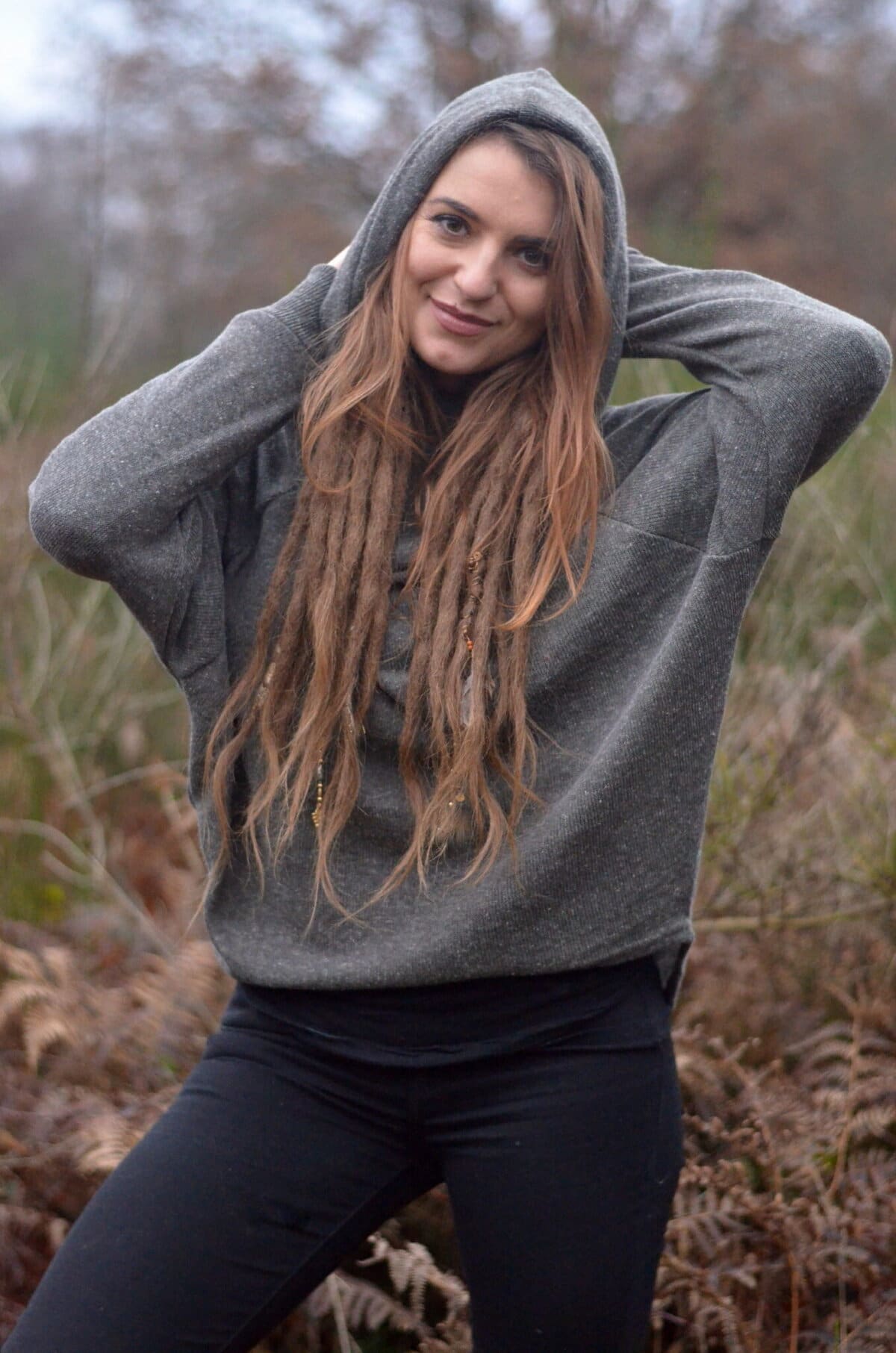 Der Pullover fällt im leichten Zipfelllook und kommt mit einer bequemen Kapuze als Hoodie daher. Die Ärmel fallen locker mit einem zipfeligen Schnitt und können dank einem kleinen Daumenloch als wärmende Stulpen getragen werden.