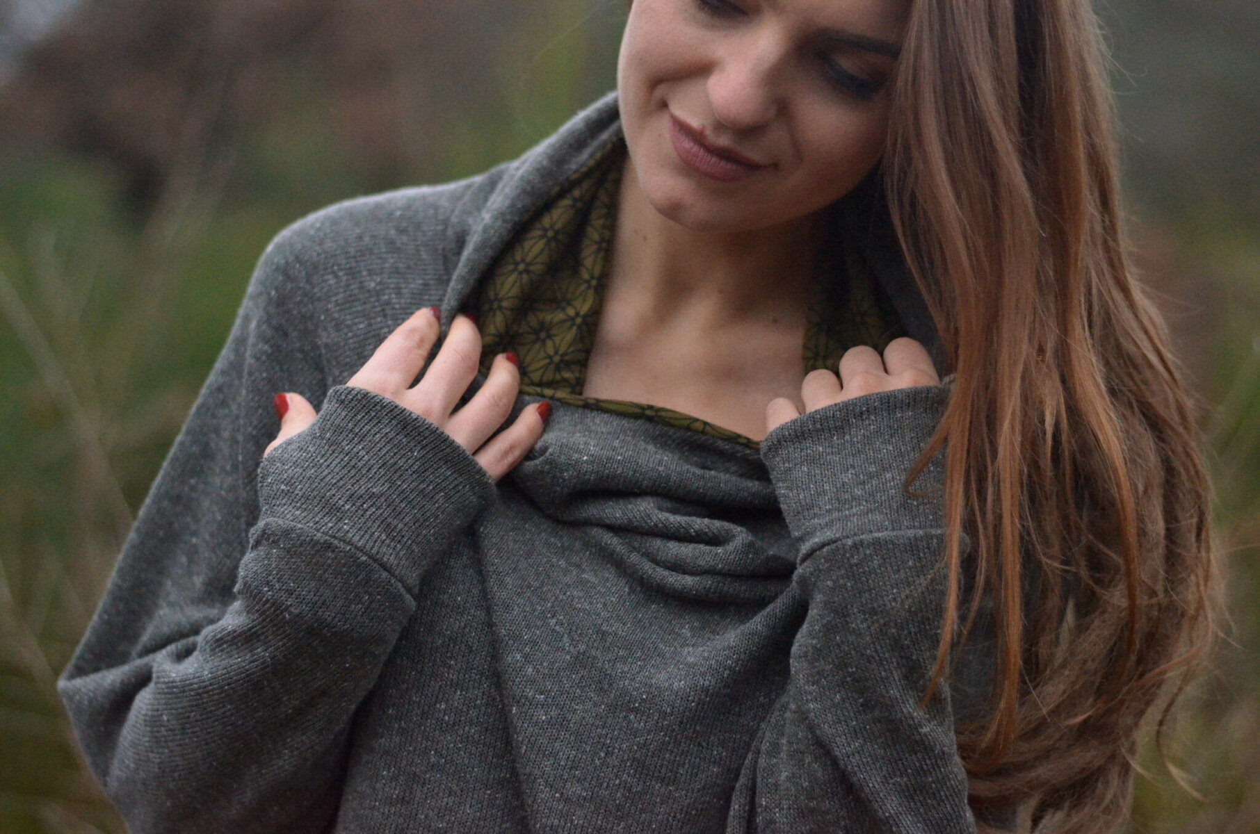 In den Kragen und die Ärmel haben wir feinen Jersey Stoff eingearbeitet mit Blume des Lebens Muster, die das Teil zu einem absoluten Hingucker machen.