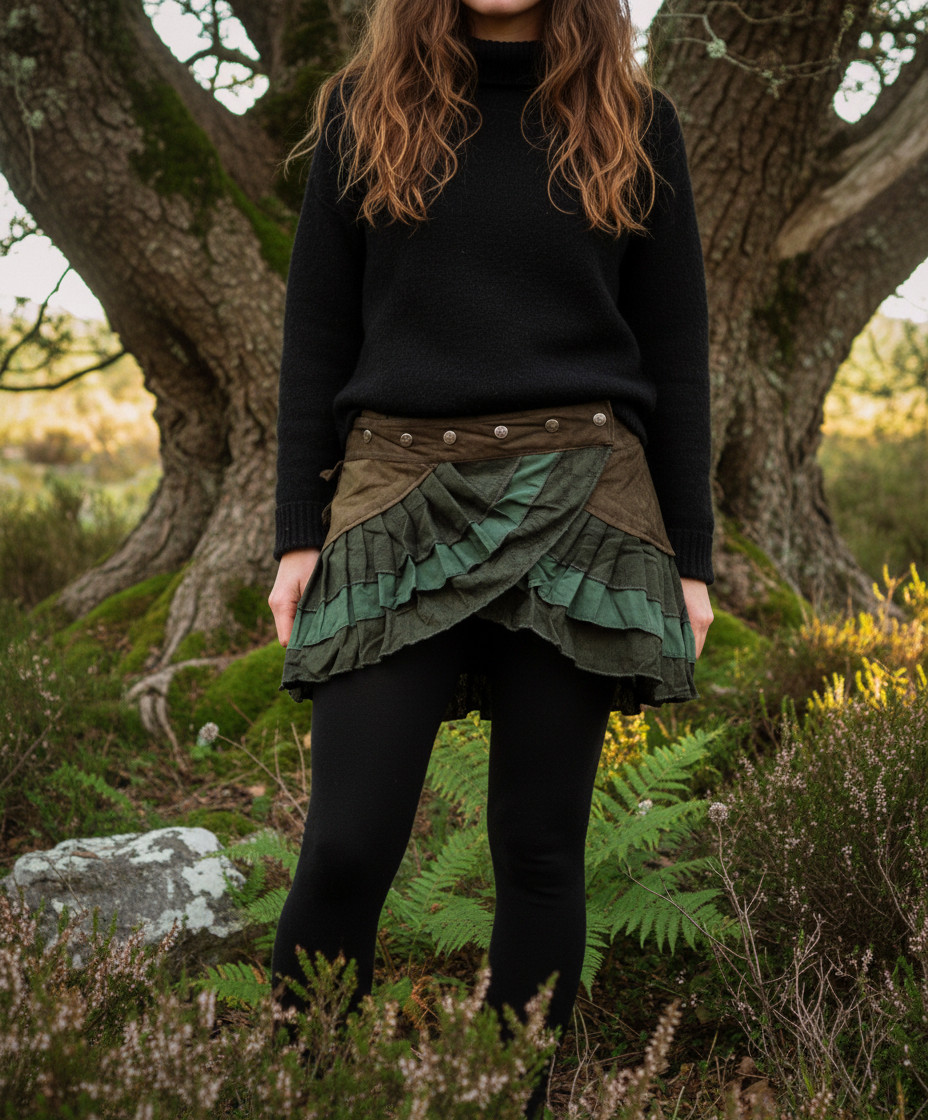 Das Besondere an diesem Rock ist sein vielschichtiges Design: In Falten gelegt und in verschiedenen Grüntönen abgestuft, erinnert er an die Struktur von Blättern oder Waldboden – lebendig, verspielt und doch kraftvoll. Darüber setzen die braunen Kunstleder-Elemente markante Akzente, die den Rock nicht nur stabil, sondern auch edgy wirken lassen. Die Kombination erzeugt einen Look, der sowohl feminin als auch wild und unabhängig ist – perfekt für Naturabenteuer, Festivals oder den Alltag mit einem alternativen Touch.