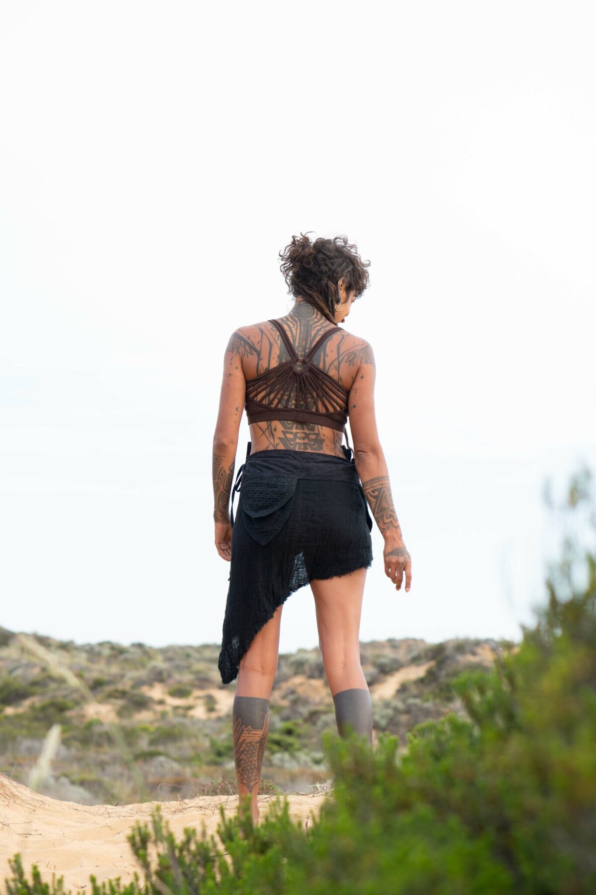 Im Rücken laufen die vielen Trägerchen zu einem Kreis zusammen und zaubern so ein schönes Muster, das an eine Sonne denken lässt.