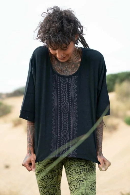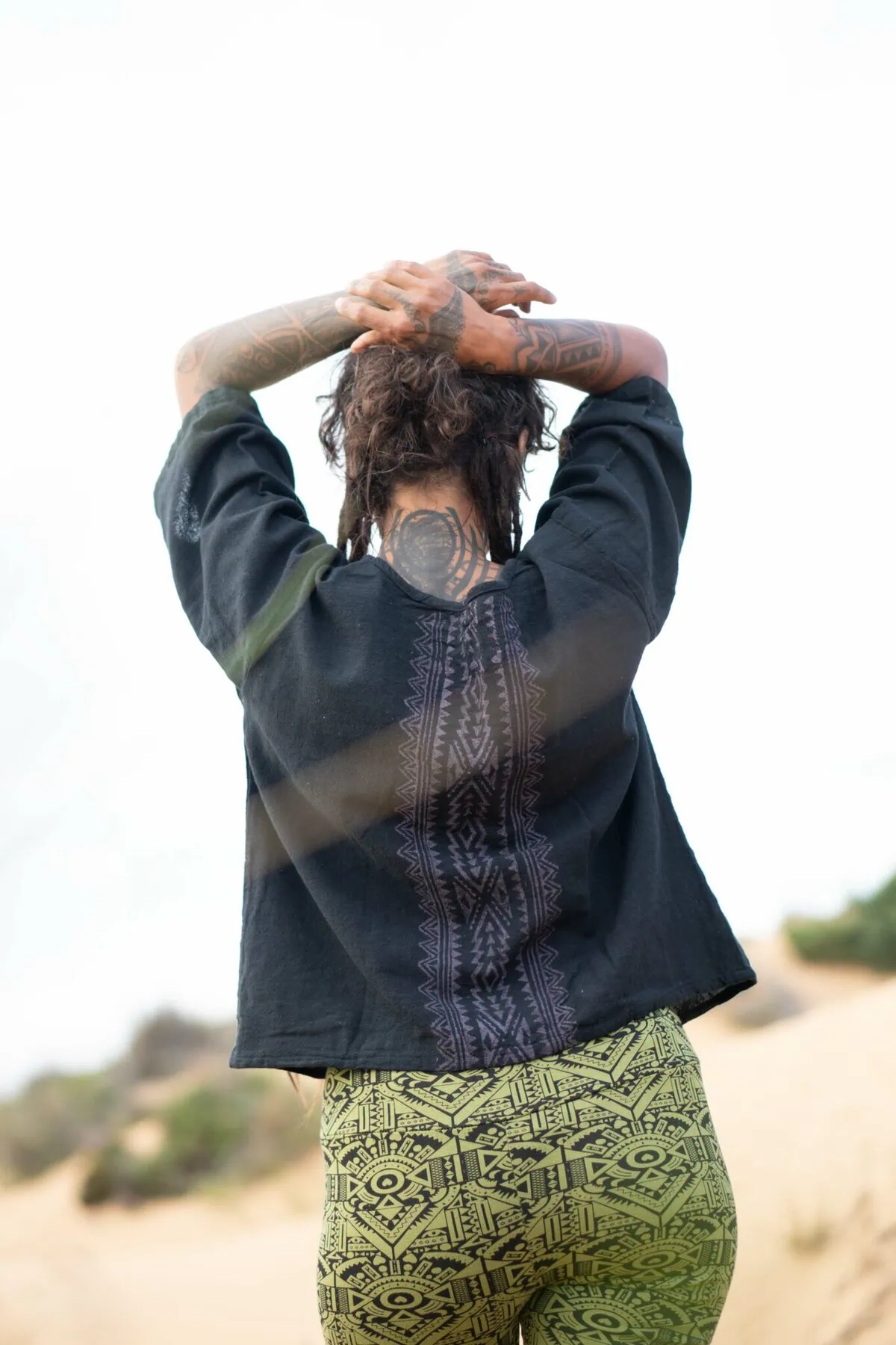 Das verträumte Oberteil nimmt dich mit auf Reise in ferne Länder. Aus einem dicken Baumwollstoff mit Juteanteil gefertigt ist das Top schön robust und kommt mit einer wunderschön natürlichen Struktur daher. In feiner Handarbeit wurde es aufgepimpt mit feinen Mustern aus organischen Farben. Die feinen Tribalmuster umspielen die Tunika und hinterlassen einen kleinen Kuss aus der Ferne.