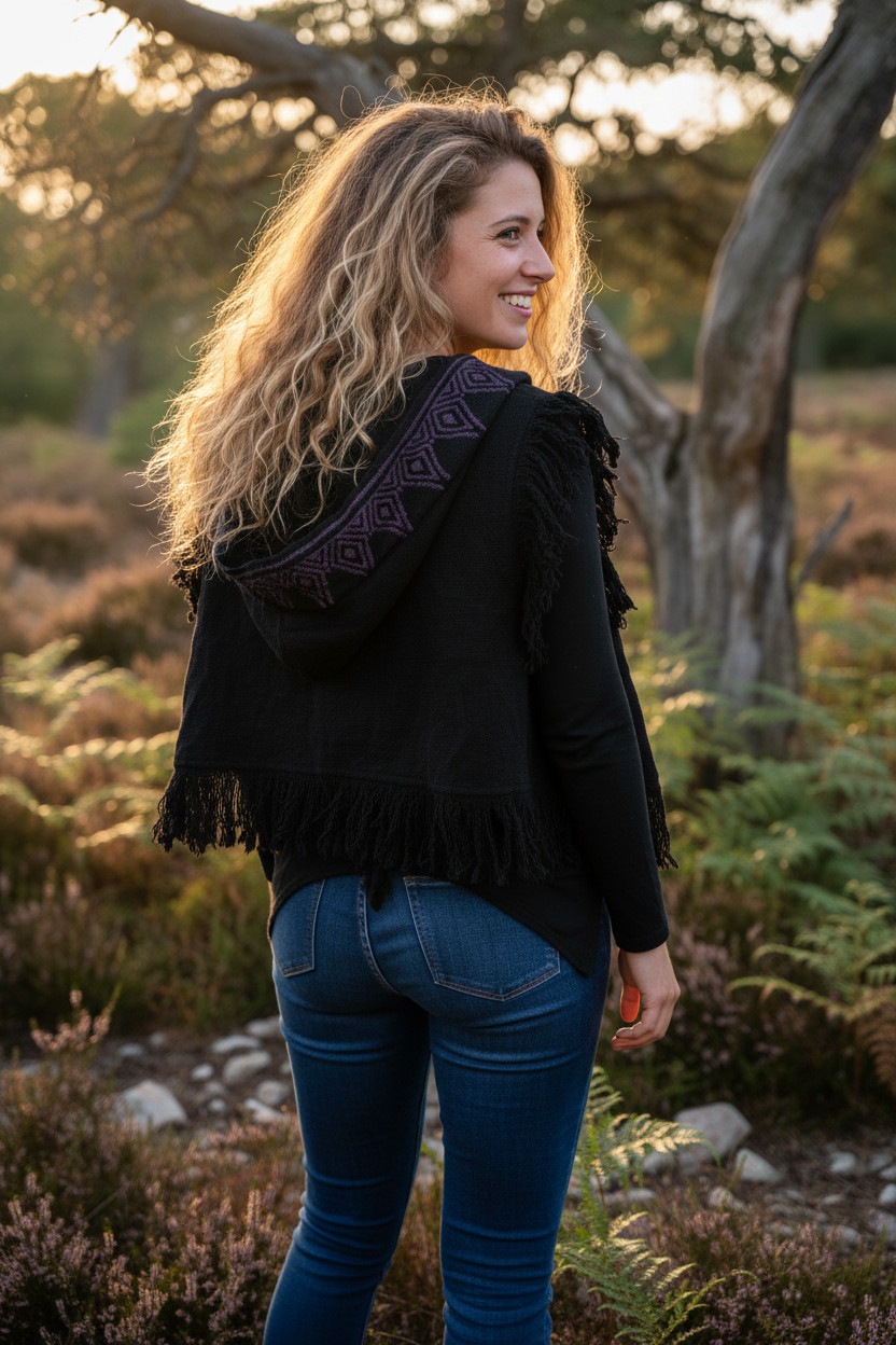 Gefertigt aus handgewebter Baumwolle, spürst du bei jedem Tragen die natürliche Textur des Stoffes – weich, leicht rustikal, lebendig. Die Fransen, die locker an Saum und Ärmeln tanzen, verleihen der Weste ihre verspielte Leichtigkeit. Der Stoff wird traditionell auf kleinen Webstühlen gefertigt – Faden für Faden, ohne Maschinen, nur mit Geduld, Handarbeit und Herz.