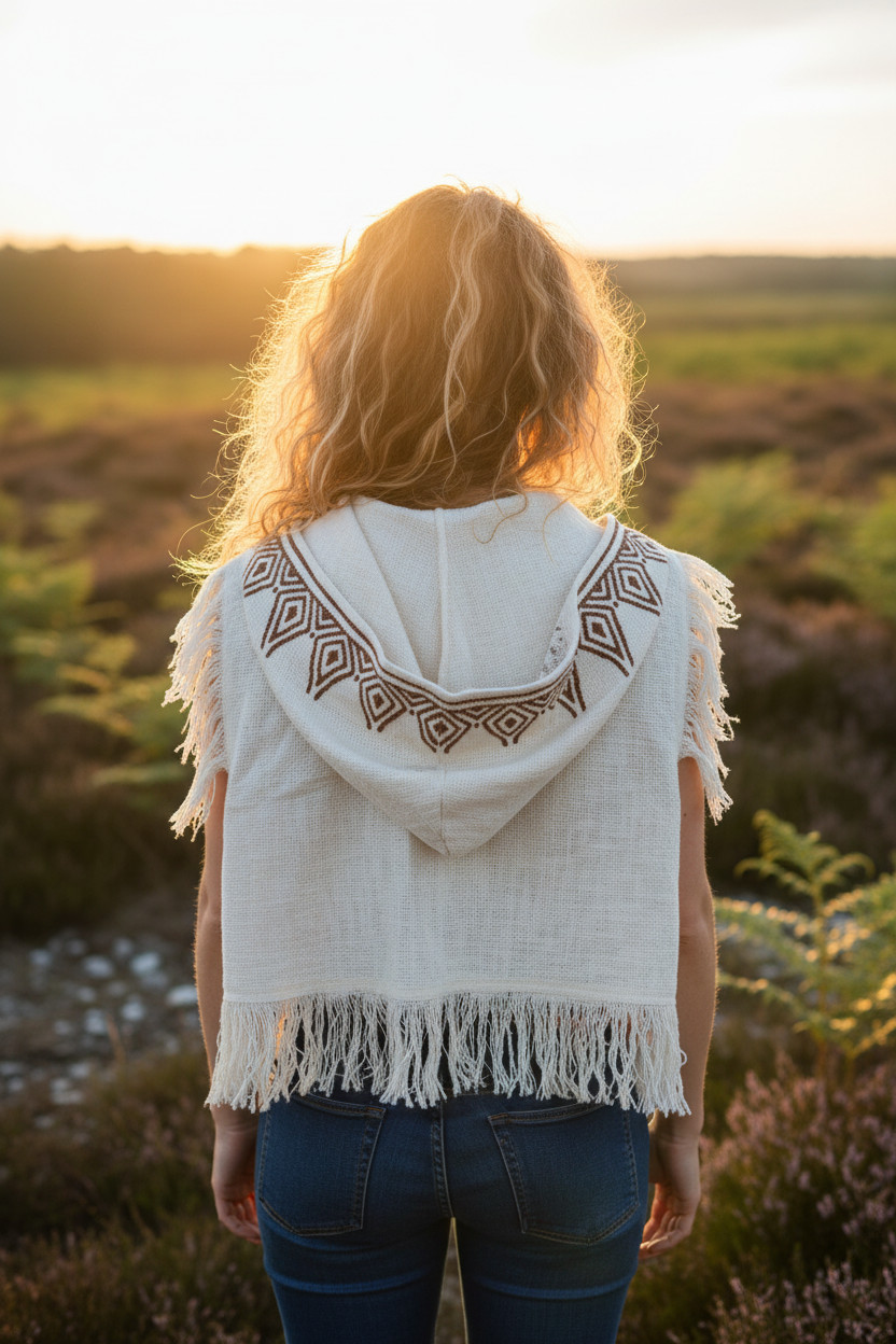 Gefertigt aus handgewebter Baumwolle, spürst du bei jedem Tragen die natürliche Textur des Stoffes – weich, leicht rustikal, lebendig. Die Fransen, die locker an Saum und Ärmeln tanzen, verleihen der Weste ihre verspielte Leichtigkeit. Der Stoff wird traditionell auf kleinen Webstühlen gefertigt – Faden für Faden, ohne Maschinen, nur mit Geduld, Handarbeit und Herz.