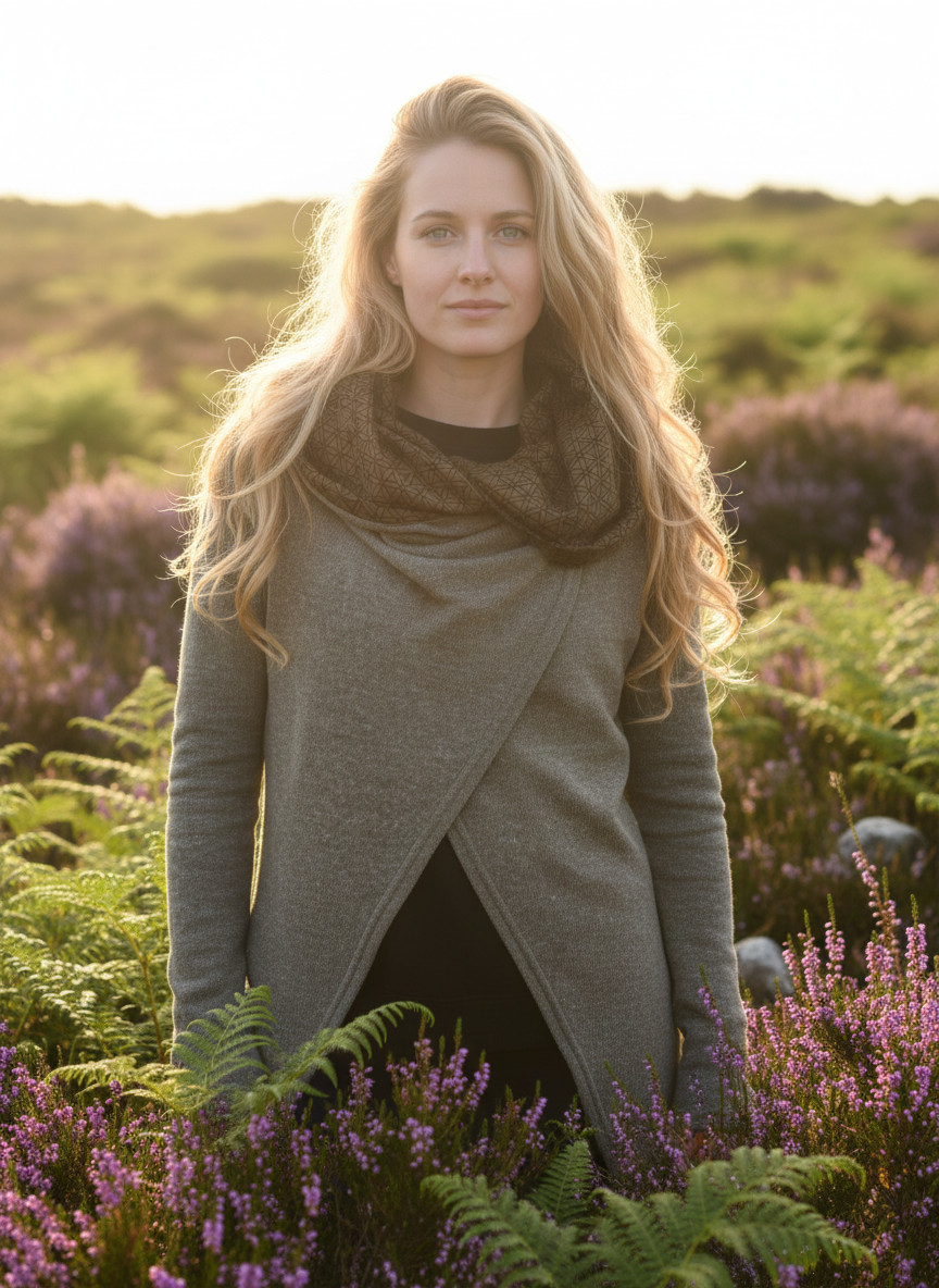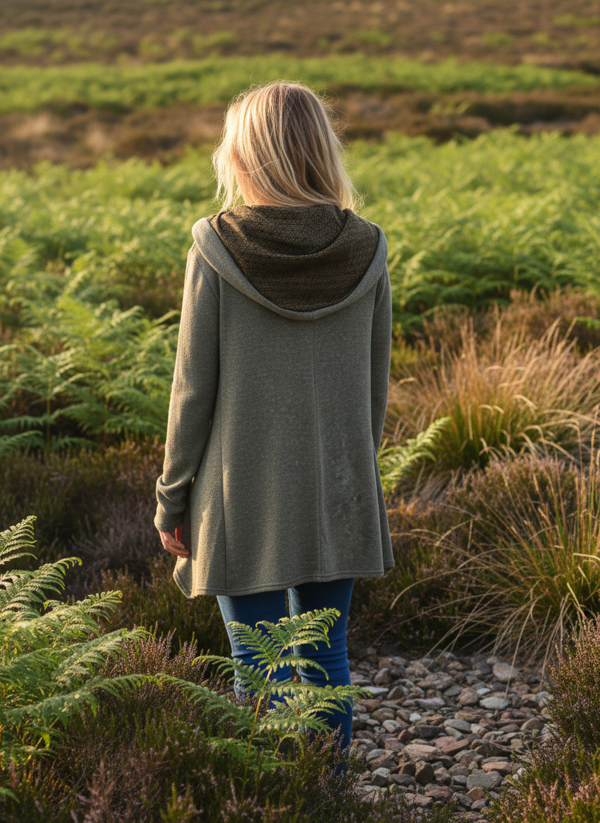 Wunderschöne, bequeme Zipfeljacke im Lagenlook. Die große Kapuze und der Kragen verschmelzen ineinander und lassen allerlei Tragevarianten zu. Über Clipverschlüsse kannst du die Jacke unterschiedlich verschließen, so entstehen ausgefallene Lagenlooks.