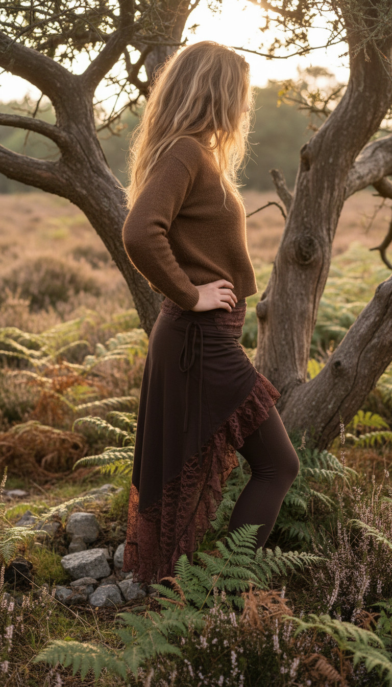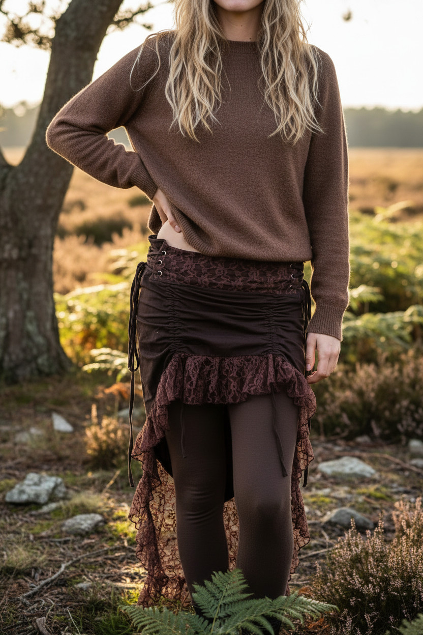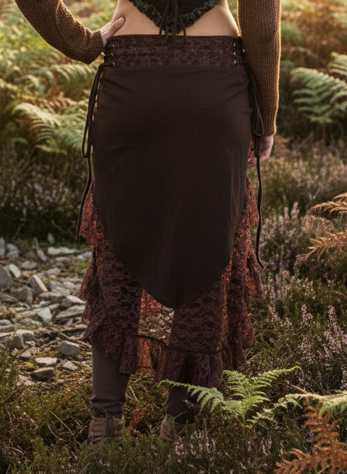 Mit seinem asymmetrischen Schnitt – vorne kürzer, hinten länger – schmeichelt er der Silhouette und lässt jede Bewegung leicht und fließend wirken. Die feine Spitze am Saum verleiht dem Rock eine geheimnisvoll-romantische Note, perfekt für Boho-Looks, Waldspaziergänge oder nächtliche Lagerfeuer.